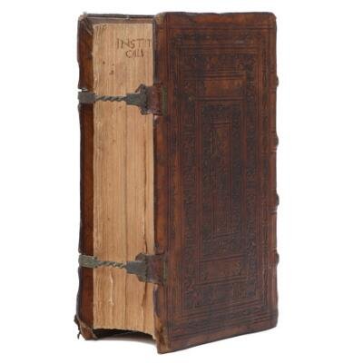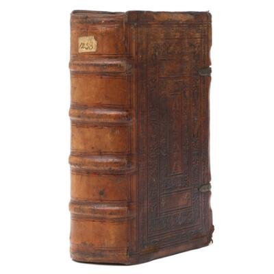 In-8vo. [16] leaves, 1–380 fol. (with several misfoliations), [72] leaves. With coat of arms of the city of Berne in woodcut on title; a few pages with underlinings. Bound in contemporary calf over bevelled wooden boards, with two original two carved brass clasps, finely blind-tooled to a three-panel design with fleurons, geometric motifs and portraits. With signs of wear due to age and use, worn corners on boards.