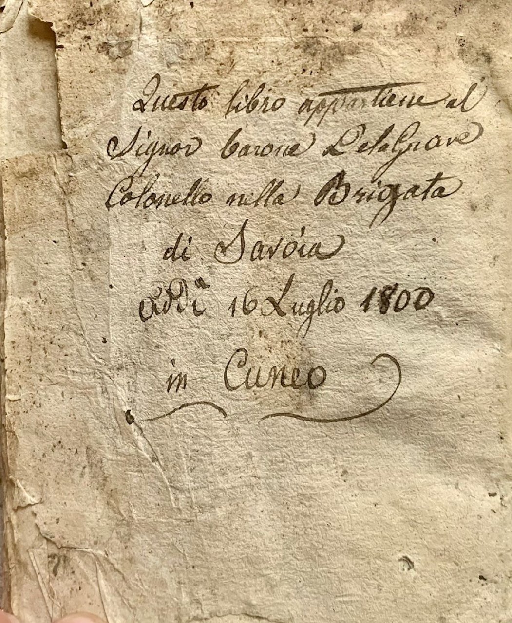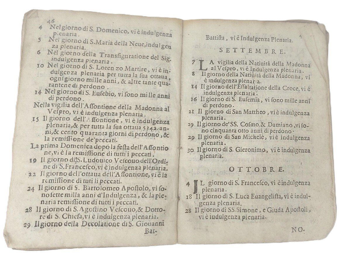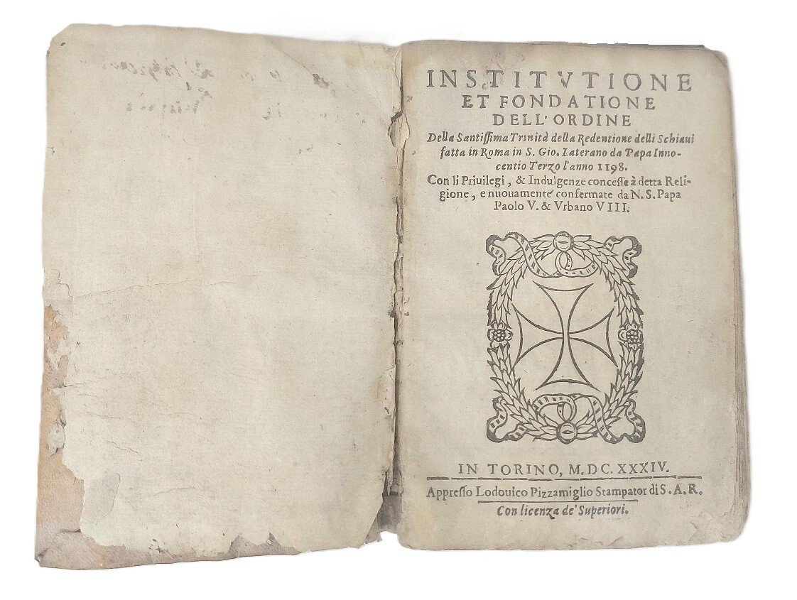 >in-8 piccolo (mm 145 x 100), pp. 83, stemma xilografico dell'Ordine della Santissima Trinità (croce di Malta) al frontespizio. Legatura coeva in piena pergamena floscia con tracce di cornice dorata sbiadita, piccoli fiori agli angoli e piccolo medaglione centrale, frontalmente usurato. Rarissima edizione torinese, sconosciuta alle bibliografie consultate e non censita dalle biblioteche italiane. L'autore, Frà Carlo Frioldo Priore della Crosetta (membro di suddetto ordine), dedica questo compendio alla Serenissima Madama Christiana di Francia, Duchessa di Savoia, chiedendole protezione "onde per uso antico la Maestà Christianissima trà suoi Conseglieri, & Elemosinieri numera il nostro Padre Generale. Nacque si può dire nella Francia il nostro Ordine, dalla pietà di alcuni principali Cauaglieri ne' tempi di Papa Innocenzo...". Compendio che raccoglie i Privilegi e le indulgenze confermate da Papa Paolo V e Urbano VIII all'Ordine religioso ed evangelico fondato da Giovanni de Matha, che volle unire il culto della Trinità all'opera di liberazione dalla schiavitù, in particolare il riscatto dei cristiani caduti prigionieri dei mori. L'ordine si prodigava per la redenzione dei sequestrati poiché sapeva che ad essi veniva proposto di tornare liberi se rinnegavano la propria fede. Ex libris ms. al piatto superiore, sulla prima e sull'ultima pagina "Questo libro appartiene al Signor Barone De la Grave Colonnello della brigata di Savoia, Addì 16 luglio 1800 in Cuneo". Esemplare con tracce d'usura.