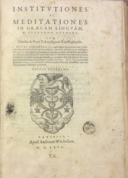 In-8 (mm. 235x160), 2 opere in un volume, cartonato muto settecentesco, 54 cc.nn. (Indici), 272 pp.num. (segue) Meditationes graecanicae in artem gramaticam, in eorum gratiam, qui viva praeceptoris voce destituuntur & literas Graecas suo ipsi ductu discere coguntur. Parisiis, Wechelum, 1565, da p. 273 a 414 (al colophon: anno Domini 1566); testo in latino e greco; frontespizi con marca tipografica (due mani sorreggono un caduceo, collocato fra due cornucopie, sormontate da Pegaso), ornato da numerose grandi iniziali inc. su legno. Cfr. Brunet,II,99 che cita le varie edizioni del Cinquecento - Adams,I,2146.Nicolaus Clenardus, nome latino del filologo Nicolaus van der Beke (1493-1542); licenziato in teologia all'università di Lovanio, vi insegnò lettere greche, per passare poi (1531) in Spagna e successivamente in Portogallo e Marocco per lo studio della lingua araba. Le sue "Institutiones graecae" (1530) e le "Meditationes.." (1531) ebbero influenza decisiva nell'insegnamento del greco sino alla fine del 18° secolo. Analoghi manuali dedicò al latino e all'ebraico. Così Diz. Treccani,III, p. 282.Macchia al frontesp., con fioriture e lievi arross. ma discreto esemplare.