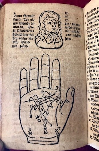 8vo (cm. 16), 2 opere legate in un vol.; 2 pp.nn., 119(1) pp., 3 pp.nn.; 9 pp.nn., 163 pp., 4 pp.nn. Seconda opera interamente illustrata con xilografie raffiguranti mani e volti umani (anche a piena pagina). Legatura antica in mz. pergamena con titolo ms. al ds. (tracce d’usura ai piatti). Note anticamente manoscritte al contropiatto anteriore e su una carta bianca finale. Carte lievemente ossidate, peraltro esemplare in ottimo stato di conservazione. Due rare opere di chiromanzia, sovente riunite in un unico volume. Cfr. Wellcome III, p. 282.