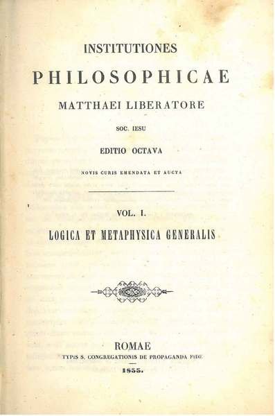 Institutiones philosophicae Matthaei Liberatore Soc. Iesu. Editio octava novis curis emendata et aucta. Vol. I: Logica et metaphysica generalis. Vol II: Metaphysica specialis. Vol. III: Ethica et ius naturae (editio quarta)