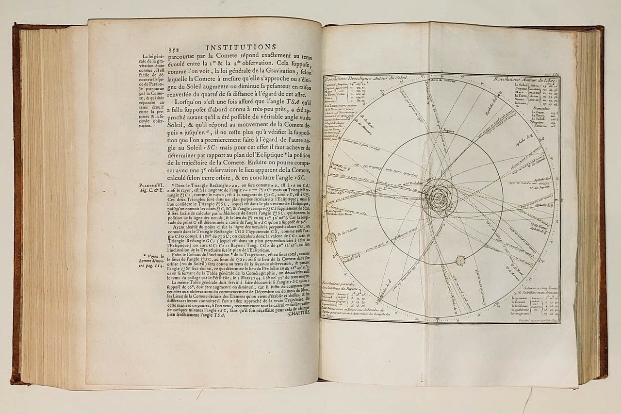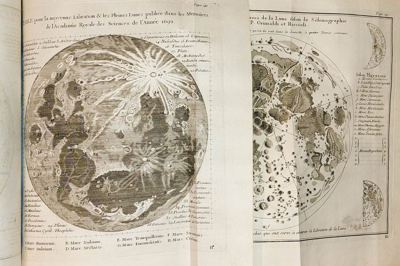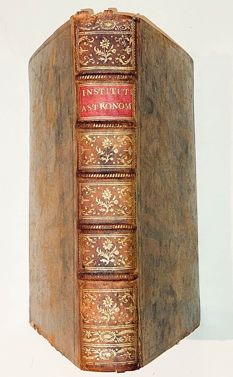 Cm 26. Pp. (8), LXIV, 660. 15 tavv. f.t. tra cui due ripiegate del planisfero celeste e tre ripiegate della superficie lunare. Legatura in piena pelle. Titolo e fregi in oro al dorso, 5 nervi. Lievi usure alla legatura, altrimenti ottimo esemplare.