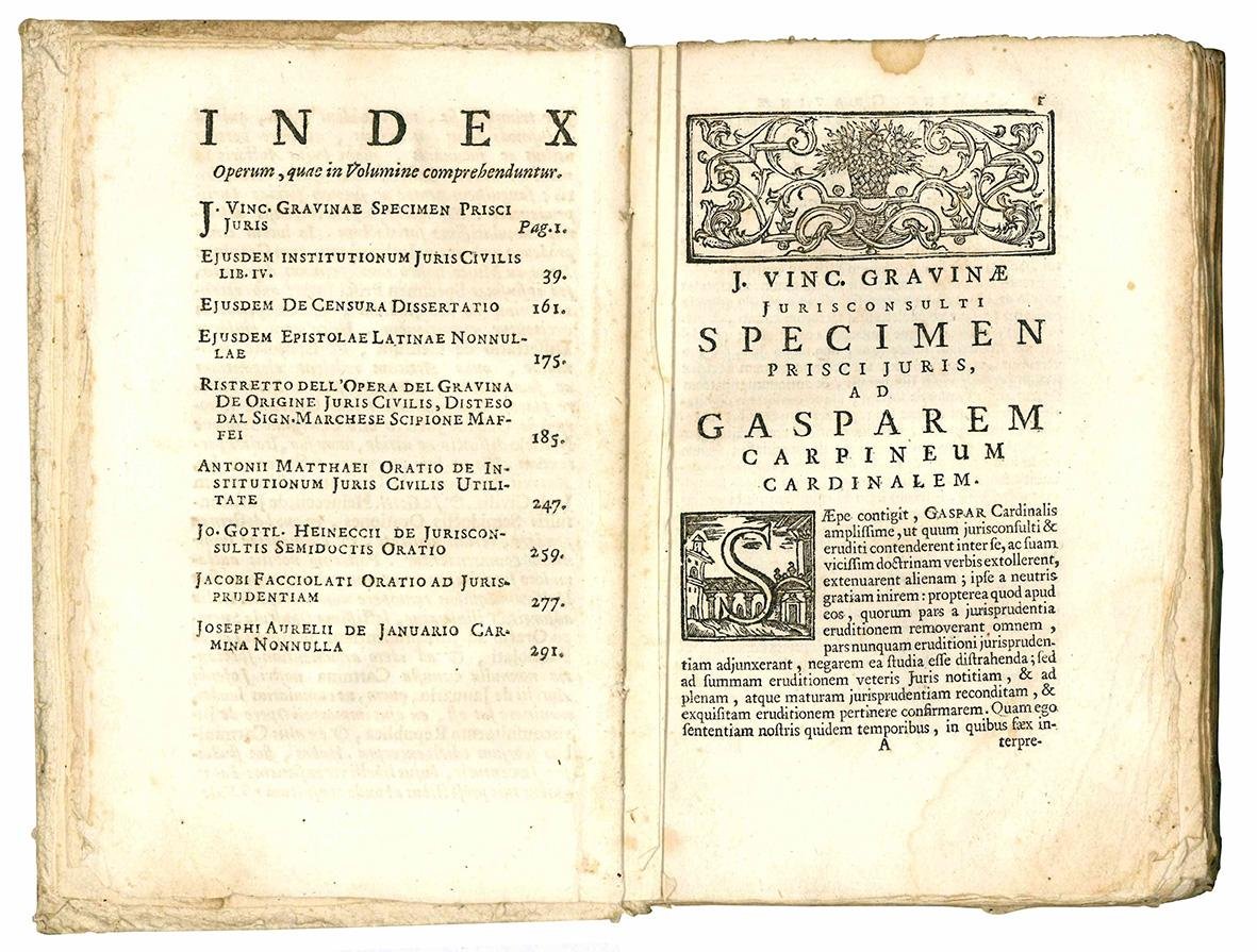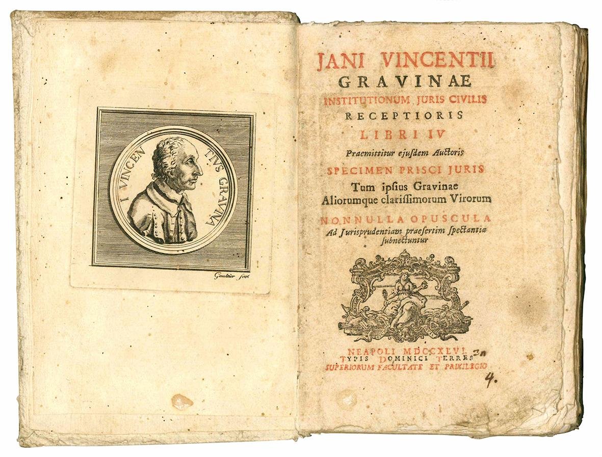 Institutionum juris civilis receptioris libri IIV Praemittitur ejusdem Auctoris specimen prisci juris Tum ipsius Gravinae Aliorumque clarissimorum Virorum Nonnulla opuscula Ad Jurisprudentiam praesertim spectantia subnectuntur.