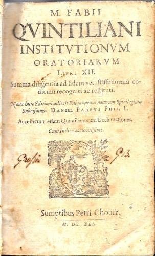 Institutionum oratoriarum libri XII. Summa diligentia ad fidem vetustissimorum codicum recogniti ac restituti. Novae huic editioni adiecit Fabianarum notarum spicilegium subcisivum Daniel Pareus phil. f. - unito - Declamationes undeviginti, His accesserunt fragmenta alia, hoc est, quae ex CCCLXXXVIII. supersunt CXLV.