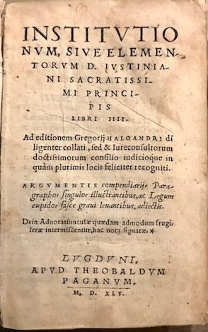 Institutionum, sive elementorum D. Iustiniani sacratissimi Principis Libri IIII. Ad editionem Gregorij Haloandri diligenter collati.