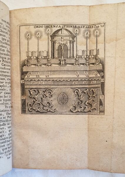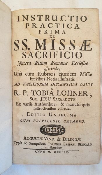 Edizione del 1759 di questa opera sul rito della Messa scritta da Tobia Lohner (1619 - 1697) gesuita. Lohner entrò nell'ordine nel 1637, lavorò come lettore in diversi luoghi e fu rettore a Lucernea e Dillingen. Oltre a numerose opere di ascetica latine e tedesche, scrisse alcune opere oastorali teologiche che ebbero molto successo. L'opera "Instructiones practicae de missae sacrificio." vide la luce nel 1670 e proseguì in una serie di edizioni, solo dal 1726 o 1739-49 in edizioni complete. All'interno partiture: Tonus in hymno angelico adhibendus, Tonus in praefation adhbendus, Tonus pro oratione dominica, Tonus in clausula missae adhibendus. All'interno: Messa in genere, riti, officio dei ministri, riti particolari (Messe votive, defunti, Vigilia, Natività di Cristo, Vescovo, nuovi Sacerdoti, Purificazione della Beata Vergine, Domenica di Passione, Sabato Santo), Benedizioni e processioni, Rubrica del rito che celebra la Messa ecc. All'interno incisione ripiegata sulla disposizione dell'altare. In ottime condizioni. Copertina in piena pelle con titolo e decorazioni in oro al dorso e piatti in ottime condizioni generali con lievi usure ai margini e dorso. Legatura in buone condizioni. All'interno le pagine si presentano in ottime condizioni con fioriture. In 16. Dim. 17,5x11 cm. Pp. (8)+329+(11). Edition of 1759 of this work about the rhyte of Mass written by Tobia Lohner (1619 - 1697). Lohner entered the Jesuit order in 1637, worked as a lecturer in several places and was rector in Lucerne and Dillingen. In addition to several Latin and German ascetic writings, he wrote some pastoral theological works that have found wide circulation. Including 11 "Instructiones practicae de missae sacrificio." which initially appeared individually from 1670, partly in a series of editions, only from 1726 or 1739-49 in complete editions. Musical scores inside: Tonus in hymno angelico adhibendus, Tonus in praefation adhbendus, Tonus pro oratione dominica, Tonus in clausula missae adhibendus. Inside: Mass in general, rhytes, officee of Ministers, particular rhytes (dead people, Vigilia, Nativity of Jesus Christ, Byshop, new priests, Purificiation of Blessed Virigin, Sunday of passion, Holy saturday), Bleessing and processions, Rhyte which celebrate Mass ecc. Folded print about disposition of altar. In very good conditions. Full leather cover with golden title and decorations in the spine and plates in very good general conditions lighlty worn in the extremities. Binding in good conditions. Inside pages are in very good conditions. with foxings In 16. Dim. 17,5x11 cm. Pp. (8)+329+(11).