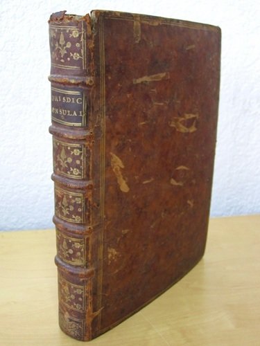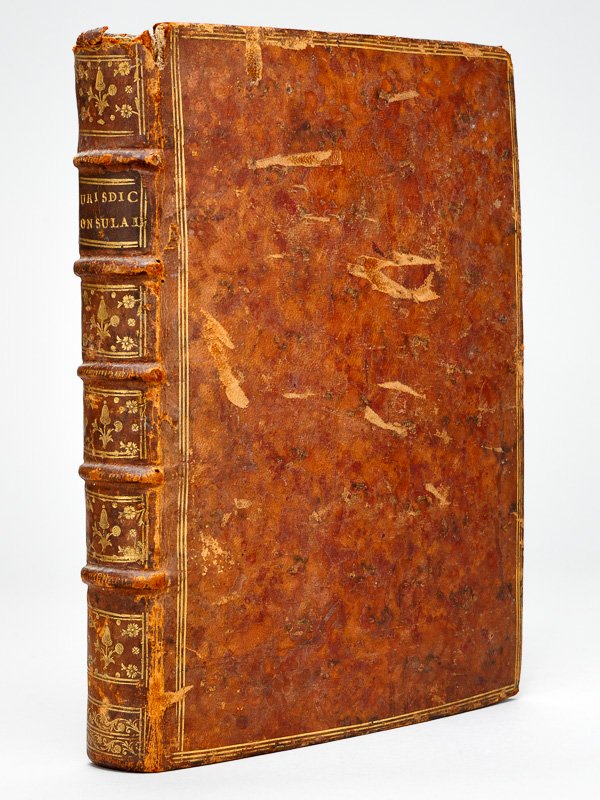 Instruction Générale du la Jurisdiction Consulaire, Avec un Recueil des Edits, Déclarations, Lettres-Patentes du Roi & Arrêts de Parlement, donnés en faveur de Messieurs les Juge & Consuls de la Cour de la Bourse Commune des Marchands de Bordeaux. Ensemble l'Etablissement de deux foires frnches & le nom de tous les Bourgeois qui ont été Juges & Consuls depuis l'installation de la Cour de la Bourse jusqu'à présent. Nouvelle édition imprimée par ordre de Messieurs Jean Mercié, Juge, Hugues Vignes, premier Consul, Pierre Loriague, second Consul, Antoine Journu de Saint-Magné, Ecuyer, troisième Consul, Jacques-Bruno Lafite-Dupont, quatrième Consul, 1 vol. in-4 reliure de l'époque pleine basane porphyre, dos à 5 nerfs orné, triple filet doré sur plats, Chez Pierre Phillippot, Bordeaux, 1786, 2 ff. (faux-titre et titre), 537 pp., 5 ff. n. ch. et 37 pp. Etat moyen (rel. frottée avec épidermures et mq. en coiffe sup., divers travaux de vers en marge n'affectant pas le texte, qq. mouill. marginales n'affectant pas le texte). Prix en l'état