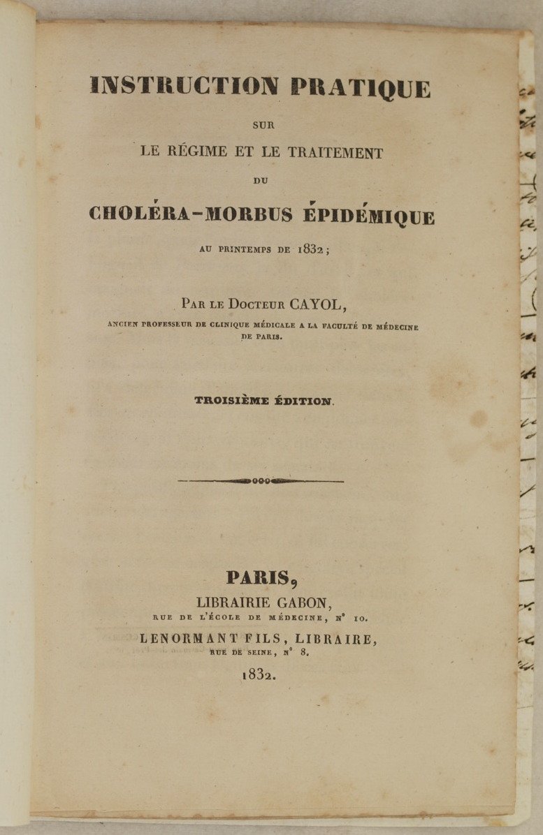 In 8 cm. 21x14. Pp. 52. Interessante pubblicazione medica del 1832 sulla cura del colera durante l'epidemia della primavera del 1832 a Parigi del Dottor Cayol.<BR>L'autore fornisce istruzione precise della cura in concomitanza con i vari sintomi.<BR>In buone condizioni e completo. Copertina morbida posticcia in buone condizioni generali con lievi usure ai margini e dorso. Legatura in buone condizioni. All'interno le pagine si presentano in buone condizioni con rare fioriture.Interesting medical pamphlet of 1832 about treatment of cholera during epidemic of spirng 1832 in Paris by Dottor Cayol. The author provides treatment to give with symptoms. In good conditions and complete. Soft false cover in good general conditions slightly worn in the edges and spine. Binding in good conditions. Inside pages are in good conditions with occasional foxings.