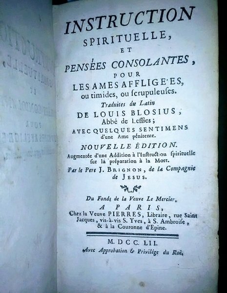 In-12, 17 x 10 cm circa. pp. 262, lxxv. Chez la Veuve Pierres Paris, 1752, Solida legatura in piena pelle, vitello francese, dorso a cinque nervi, titolo e ornamenti floreali in oro. Si tratta di una nota guida spiritualle, in questo caso acresciuta da un compendio di riflessioni in preparazione della buona morte. Interessante come iil volume nasca da un'iniziativa imprenditoriale femminile: du fonds de la Veuve Mercier / chez la Veuve Pierres. Dorso leggermente inaridito, con mancanza al piede, mancanza di un centimetro circa che interessa il piatto interiore particolarmente nell'agolo basso. Timbro di antica biblioteca ecclesiastica all'occhiello. In-12, pp. 262, lxxv. Paris, 1752, Solid full leather binding, french calf, five-bands spine, title and floral ornaments in gold. It is a well-known spiritual guide, in this case enhanced by a compendium of reflections in preparation of a good death. Interesting how the volume arises from a female business initiative: du fonds de la Veuve Mercier / chez la Veuve Pierres. Slightly parched spine with lack in the foot, and lack of about one centimeter affecting the inner plate particularly in the low angle. Old ecclesiastical library stamp.