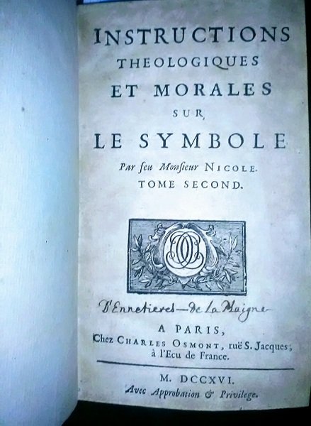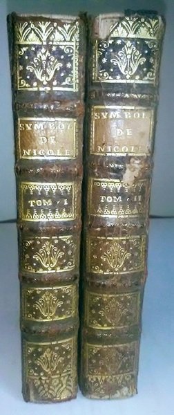 in-12, 16 x 10 cm circa, chez Osmont, Paris, 1716 Due tomi. I: pp (10) 438 (6), II (8) 505. Solide legature settecentesche in pieno vitello francese, dorso a cinque nervi, titolo in oro su tassello rosso, ornamenti floreali in oro. Sguardi decorate. Piccole mancanze ai dorsi, che non pregiudicano la gradevolezza, piatti con segni di usura da sfregamento, angoli arrotondati, foxy. Carta in ottimo stato di conservazione, qualche brunitura. Scritte di mano antica sulle prime carte bianche di entrambi i volumi. In-12, chez Osmont, Paris, 1716 Two volumes. I: pp (10) 438 (6), II (8) 505. Solid eighteenth-century French calfskin bindings, five-band spines, gold title on red label, gold floral ornaments. Decorated endpapers. Red edges. Small lacks in the spines, which do not affect the pleasantness, signs of wear from rubbing, dented corners, foxy. Paper in excellent condition, some bluing. Ancient hand lettering on the first white papers of both volumes.