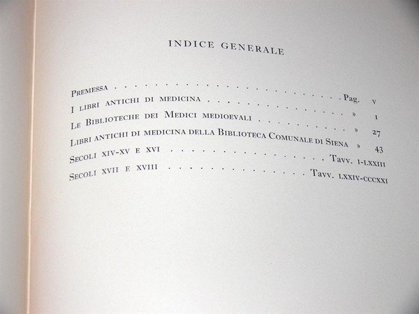 Il curatore della selezione, Alcide Garosi, introduce il volume con una colta dissertazione di carattere storico bibliografico, accompagnata da un saggio sulle caratteristiche dei testi utilizzati dai medici nel Medio Evo e da una presentazione delle opere scientifiche presenti nella Biblioteca senese; una raccolta ricca e scelta, ereditato dalla locale facoltà di Medicina, che si allarga anche a materie collaterali.