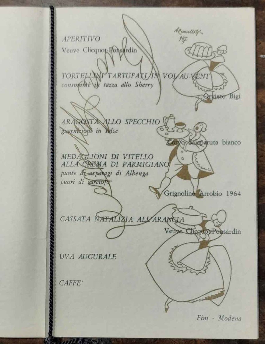 <p>20x13 cn, doppio cartoncino stampato in oro che comprende, legato da cordino in seta, doppio foglio con tre disegni in oro di Alesandto Cervellati e menu fornito da Fini di Modena. Salone del Podestà, 22 dicembre 1967</p>
