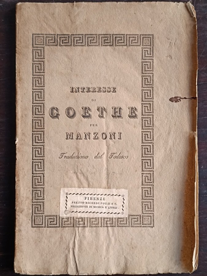 <span style="font-style: normal;">In-8° (cm. 21,2), brossura editoriale a stampa con titoli ai piatti inquadrati da una cornice grecizzante in xilografia (mancanze al dorso, cartellino di libreria applicato al piatto anteriore); pp. 72 in barbe, in buono stato (alcune fioriture, antica nota manoscritta al risguardo); marca tipografica in xilografia al frontespizio. Interessante e assai rara edizione originale della traduzione curata da Camillo Ugoni di questa raccolta di scritti dedicati da Goethe a Manzoni [cfr. Helveticat]. «Traduzione felice [.] che rende anche la sfumatura, l'obiettiva consacrazione che al solo interesse di Goethe per qualcuno doveva per forza conseguire». [G. Gaspari, </span><i>Goethe traduttore di Manzoni</i>, in <i>Goethe traduttore e tradotto</i>, p. 234]. Buon esemplare. (NJ1)