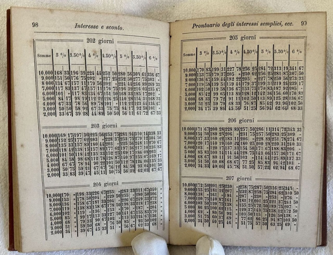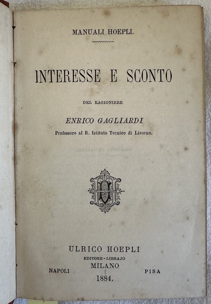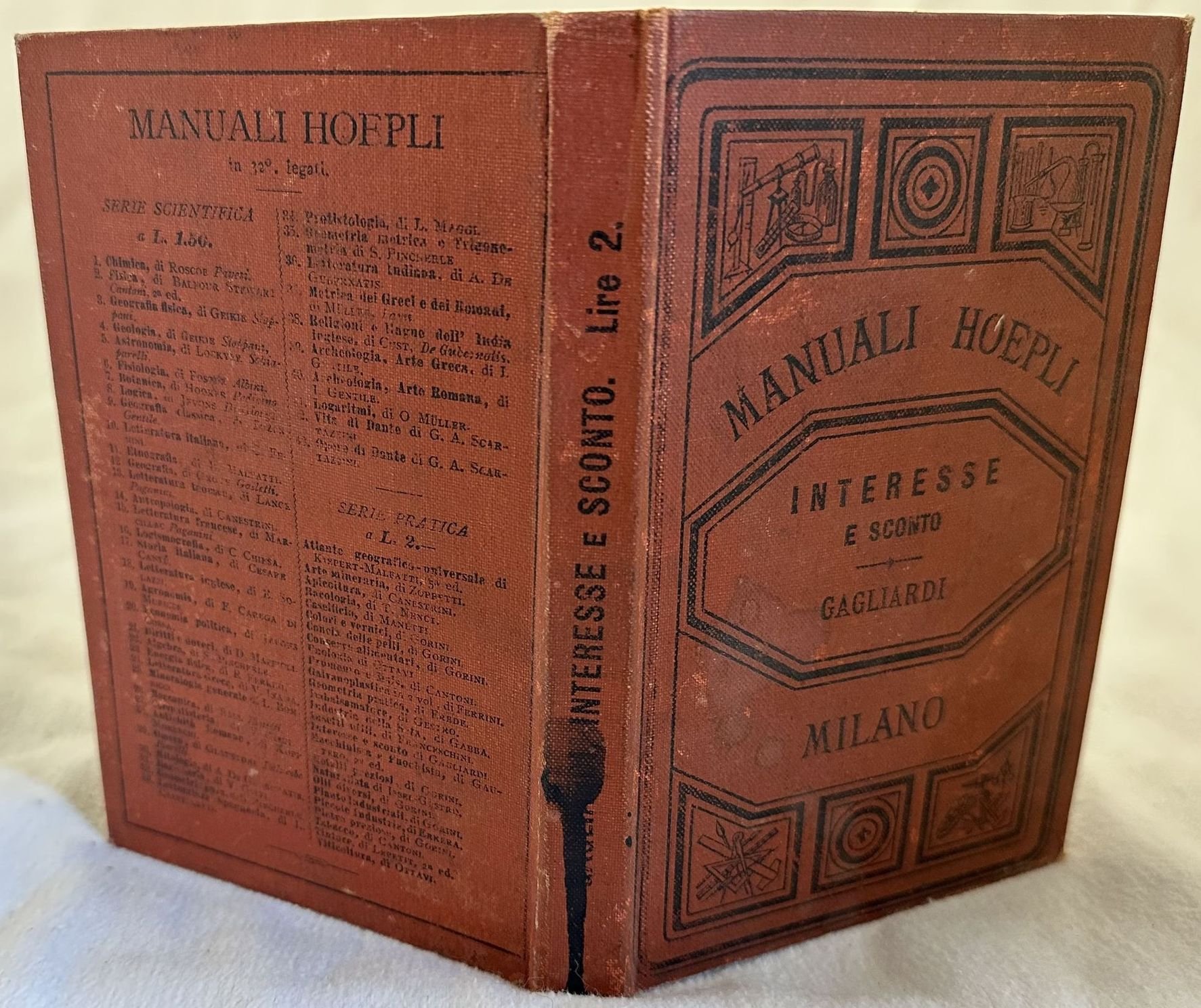 Edizione del 1884 di questo manuale Hoepli sull'interesse e lo sconto scritto da Enrico Gagliardi. In ottime condizioni. Copertina in tela editoriale in buone condizioni generali con lievi usure ai margini e dorso. Legatura in buone condizioni. Pagine in buone condizioni con rare fioriture. In 16. cm 15,5x10,5. Pp. V+203+(1)Edition of 1884 of this Hoepli manual about interest and discount written by Enrico Gagliardi. In very good conditions. Cloth editorial cover in good conditions lightly worn in the extremities. Binding in good conditions. Pages in good conditions with occasional foxing. In 16. cm 15,5x10,5. Pp. V+203+(1)