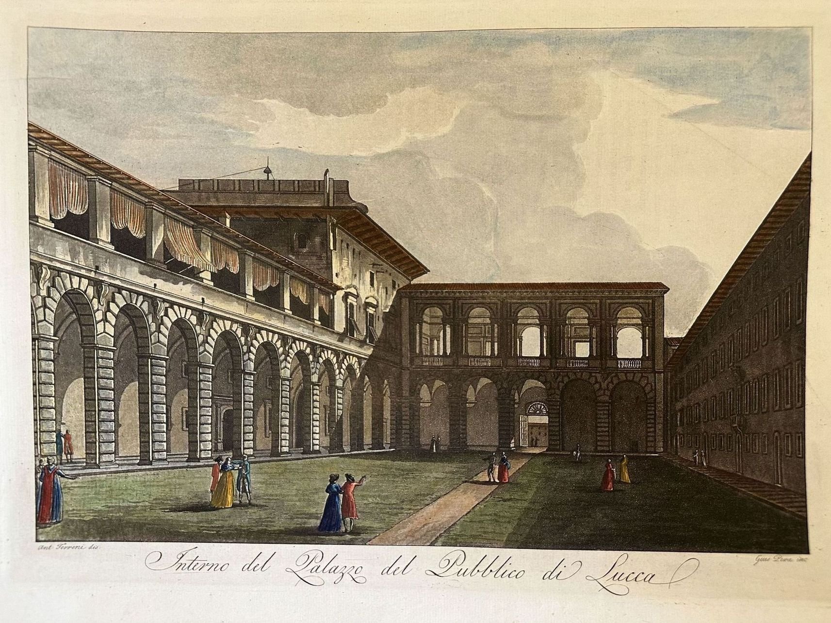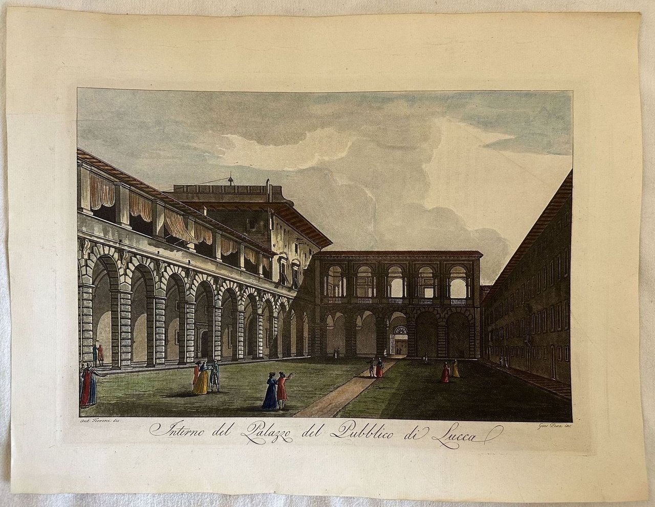 Veduta animata del 1801 dell'interno del Palazzo del Pubblico di Lucca. Testo in lingua italiana "Acquatinta, disegnata dal Terreni, del quale si Hanno poche note ma è molto probabile che fosse un parente de Giuseppe Maria Terreni (1739-1811), native of Livorno e attivo a Firenze, celebrato vedutista" (Cfr. Brunet II, 1330; Graesse II, 611) Di grandi dimensioni. Atlante: "Viaggio pittorico della Toscana", Firenze Giuseppe Tofani Autore: Giuseppe Pera su disegno di Antonio Terreni Data: 1801 Tecnica: acquatinta colorata a mano Dimensione del foglio: 435x335 mm Dimensione incisione: 365x265 mm Condizioni: Buone. Rare fioriture.Very fine animated view of 1801 of the internal of Public Palace of Lucca. Of big size "Acquatinta, disegnata dal Terreni, del quale si Hanno poche note ma è molto probabile che fosse un parente de Giuseppe Maria Terreni (1739-1811), native of Livorno e attivo a Firenze, celebrato vedutista" (Cfr. Brunet II, 1330; Graesse II, 611) Atlas: "Viaggio pittorico della Toscana", Firenze Giuseppe Tofani Author:Giuseppe Pera after Antonio Terreni Date: 1801 Technique: acquatinct coloured by hand Leaf Dimension: 435x335 mm Engraving Dimension: 365x265 mm Conditions: Good conditions. Occasional foxing.