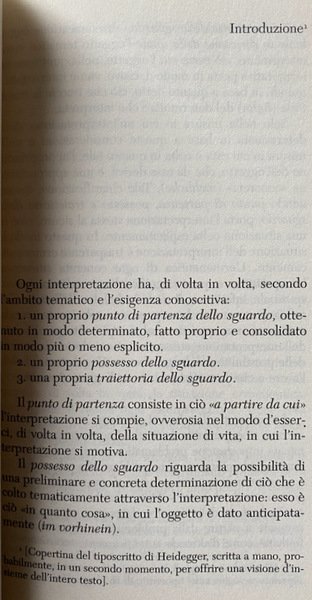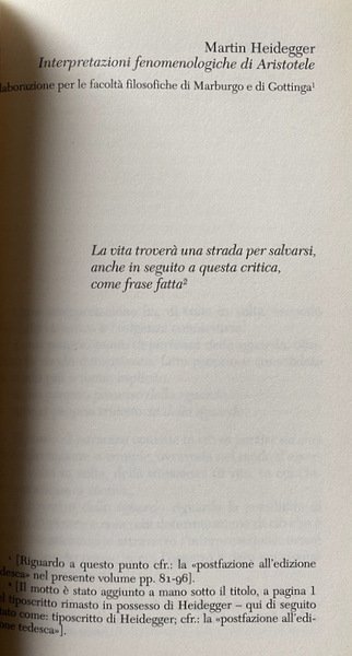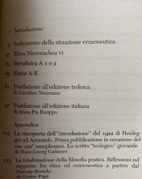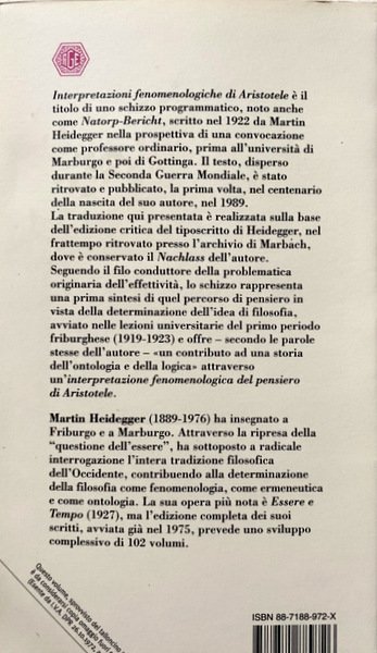Soggetti: Filosofia Antica, Filologia, Metafisica, Fenomenologia, Ontologia, Ermeneutica, Opere generali, Aristotele, Socrate, Lezioni universitarie, Corsi, Seminari, Critica, Interpretazione, Novecento, Logica, Nietzsche, Metafisica, Vattimo, Differenza, Nous Praktikos, Franco Volpi, Coscienza, Temporalità, Esistenzialismo ontologico e fenomenologico, Fenomenologia, Husserl, Friburgo, Jaspers, Von der mannigfachen Bedeutung des Seienden nach Aristoteles, Essere e tempo, Scetticismo, Philosophy, Phänomenologische Interpretation ausgewählter Abhandlungen des Aristoteles zu Ontologie und Logik, Anzeige der hermeneutischen Situation, Natorp-Bericht, Lutero, Luther, Ermeneutica, Platone, Parmenide, Wahrsein und Dasein, Aristoteles, Ethica Nicomachea, Scritti giovanili, Metaphysik, Metaphysics, Difference, Conscience, Relativismus, Erkenntnistheorie, Sorgen, Skeptizismus, Welt, Erkenntnistheorie, Explikation, Lebens, Faktizität, Ancient Philosophy, Philology, Socrates, Ontology, Temporality, Ontological and phenomenological existentialism, Phenomenology, Fogli sparsi, Appunti, Scattered sheets, Notes, Libri Vintage fuori catalogo, Saggi, Out of print Books, Essays, Corsi friburghesi 1928–1944, Umgehen, Auslegen, Gottinga, Fisica, Hans-George Gadamer, Scritto teologico giovanile, Göttingen, Riferimento, Consultazione, Liberi rari, Collezionismo, Studi filosofici, Reference, Consultation, Rare Freedoms, Collecting, Philosophical Studies