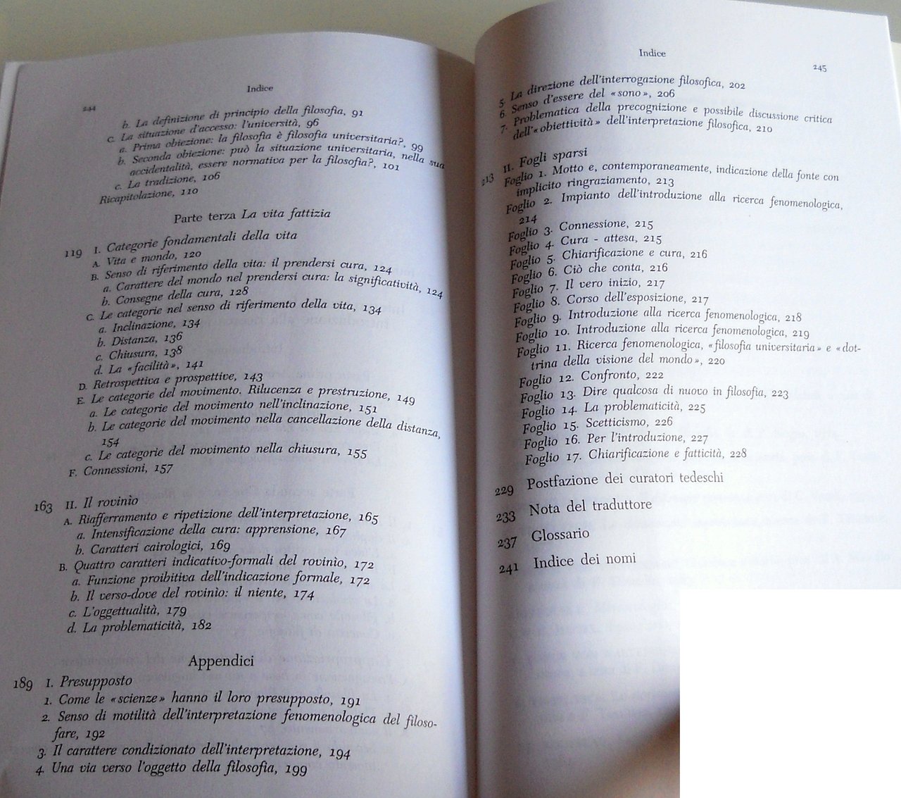 Soggetti: Filosofia Antica, Filologia, Metafisica, Fenomenologia, Ontologia, Ermeneutica, Opere generali, Aristotele, Socrate, Lezioni universitarie, Corsi, Seminari, Critica, Interpretazione, Novecento, Logica, Gadamer, Nietzsche, Metafisica, Vattimo, Differenza, Nous Praktikos, Franco Volpi, Coscienza, Temporalità, Esistenzialismo ontologico e fenomenologico, Fenomenologia, Husserl, Friburgo, Jaspers, Von der mannigfachen Bedeutung des Seienden nach Aristoteles, Essere e tempo, Scetticismo, Philosophy, Phänomenologische Interpretation ausgewählter Abhandlungen des Aristoteles zu Ontologie und Logik, Anzeige der hermeneutischen Situation, Natorp-Bericht, Lutero, Luther, Ermeneutica, Platone, Parmenide, Wahrsein und Dasein, Aristoteles, Ethica Nicomachea, Scritti giovanili, Metaphysik, Metaphysics, Difference, Conscience, Relativismus, Erkenntnistheorie, Sorgen, Skeptizismus, Welt, Erkenntnistheorie, Explikation, Lebens, Faktizität, Ancient Philosophy, Philology, Socrates, Ontology, Temporality, Ontological and phenomenological existentialism, Phenomenology, Fogli sparsi, Appunti, Scattered sheets, Notes, Libri fuori catalogo, Saggi, Books out of print, Essays, Corsi friburghesi 1928–1944