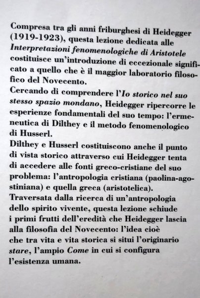 Compresa fra gli anni friburghesi di Heidegger, questa lezione dedicata alle Interpretazioni fenomenologiche di Aristotele costituisce un'introduzione di eccezionale significato a quello che è il maggior laboratorio filosofico del Novecento. Cercando di comprendere l'Io storico nel suo stesso spazio mondano, Heidegger ripercorre le esperienze fondamentali del suo tempo: l'ermeneutica di Dilthey e il metodo fenomenologico di Husserl. Dilthey e Husserl costituiscono anche il punto di vista storico attraverso cui Heidegger tenta di accedere alle fonti greco-cristiane del suo problema: l'antropologia cristiana e quella greca.