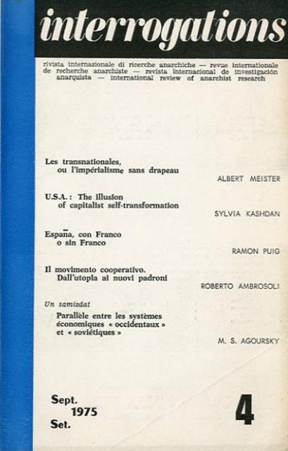 Interrogations n. 4 (set. 1975). Revue internationale de recherche anarchiste = rivista internazionale di ricerche anarchiche = revista internacional de investigacion anarquista = international review of anarchist research.