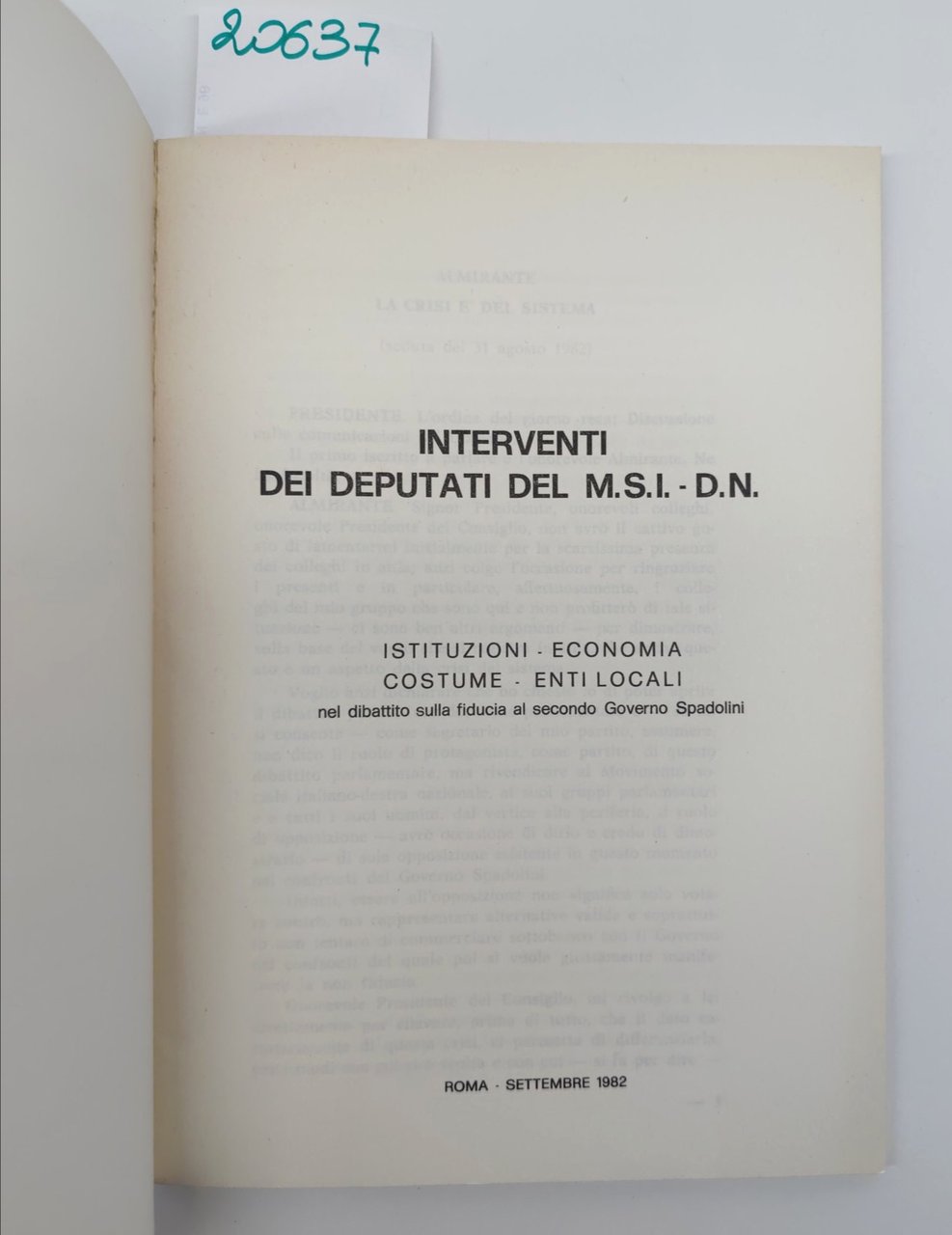 Interventi dei deputati del MS.I. - D.N. istituzioni economia costume enti locali nel dibattito sulla fiducia al secondo governo Spadolini Roma settembre 1982 Edizioni Parlamentari