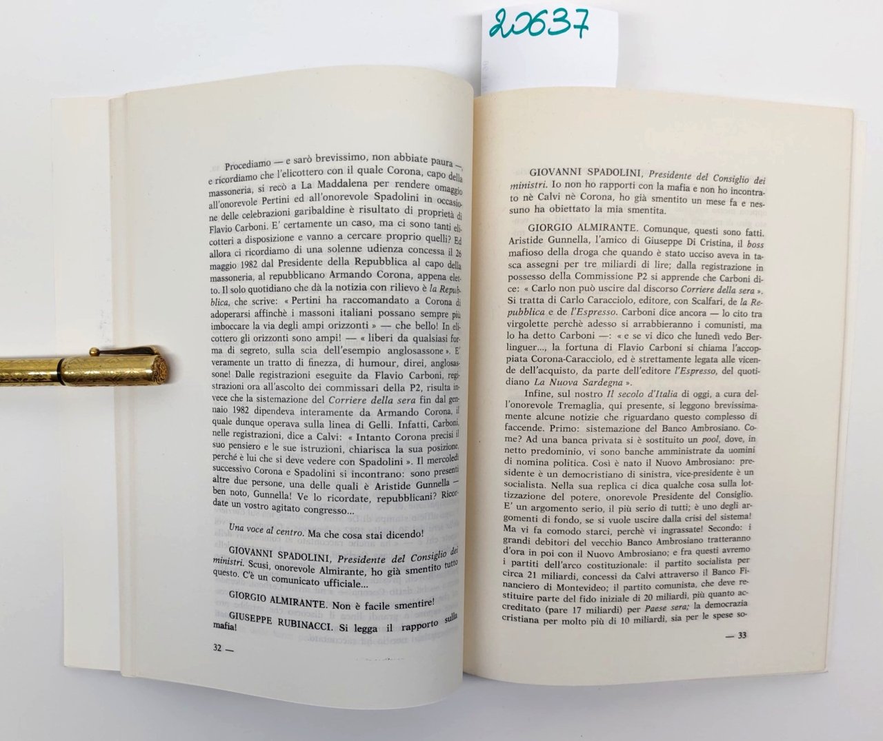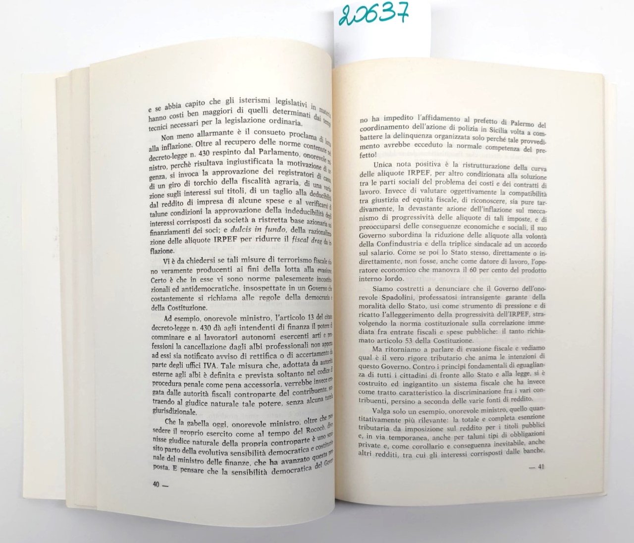legatura morbida editoriale con uno strappo di cm. 5 al margine superiore tra piatto anteriore e dorso riparato, alcune sporcizia ai piatti, una piega all'angolo superiore alla quarta di copertina che va ad interessare le ultime pagine, tagli leggermente ingialliti, numero pagine 81 + indice all'interno interventi di Almirante La crisi del sistema, Rubinacci La politica economica siamo alla bancarotta, Tatarella La crisi delle istituzioni negli enti locali, Tremaglia La politica estera, Pazzaglia un governo per non governare dimensioni cm 23,5 * 16,6 * 0,5