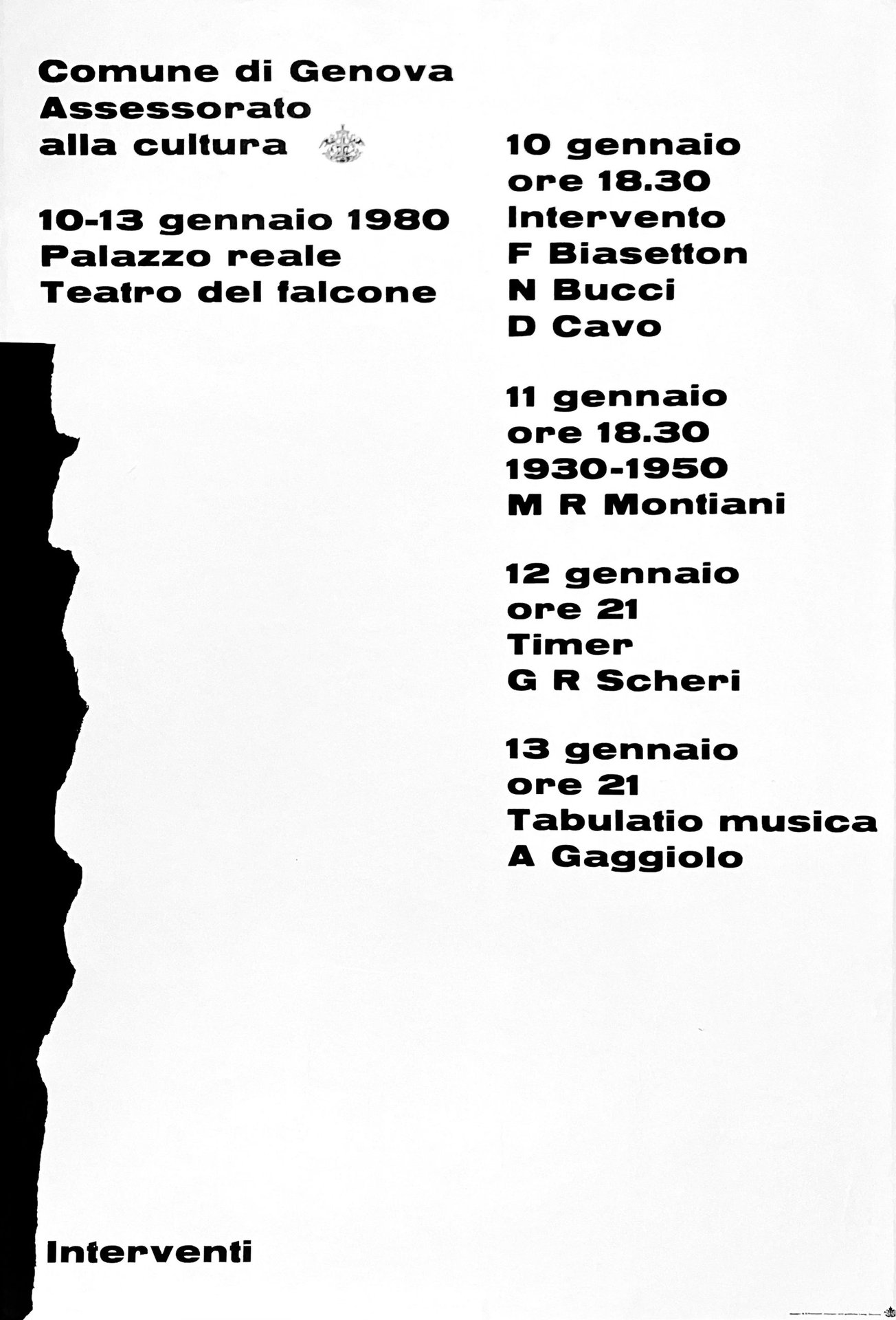 Manifesto della mostra tenutasi dal 10 al 13 gennaio 1980 a Genova presso il Teatro del Falcone, con la partecipazione di Francesca Biasetton, Nicola Bucci, Danilo Cavo, Maria Rosa Montiani, Gianriccardo Scheri e Amedeo Gaggiolo.