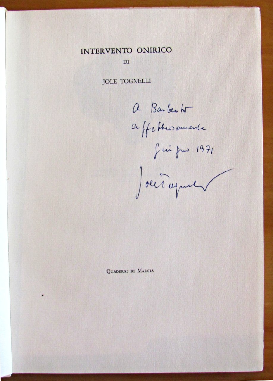 Molte illustrazione in b/n e in tinta n.t. e 8 tavole in b/n f.t. delle opere di Jole Tognelli. Quaderni di Marsia - Edizione Fuori Commercio di 399 esemplari numerati e firmati dall'autrice, nostro N. 32. Roma 15 Maggio 1971. Cartoncino editoriale con ali. 17x25; pp.97. Dedica autografa dell'autrice al frontespizio. Ottimo stato. , Ottimo (Fine)