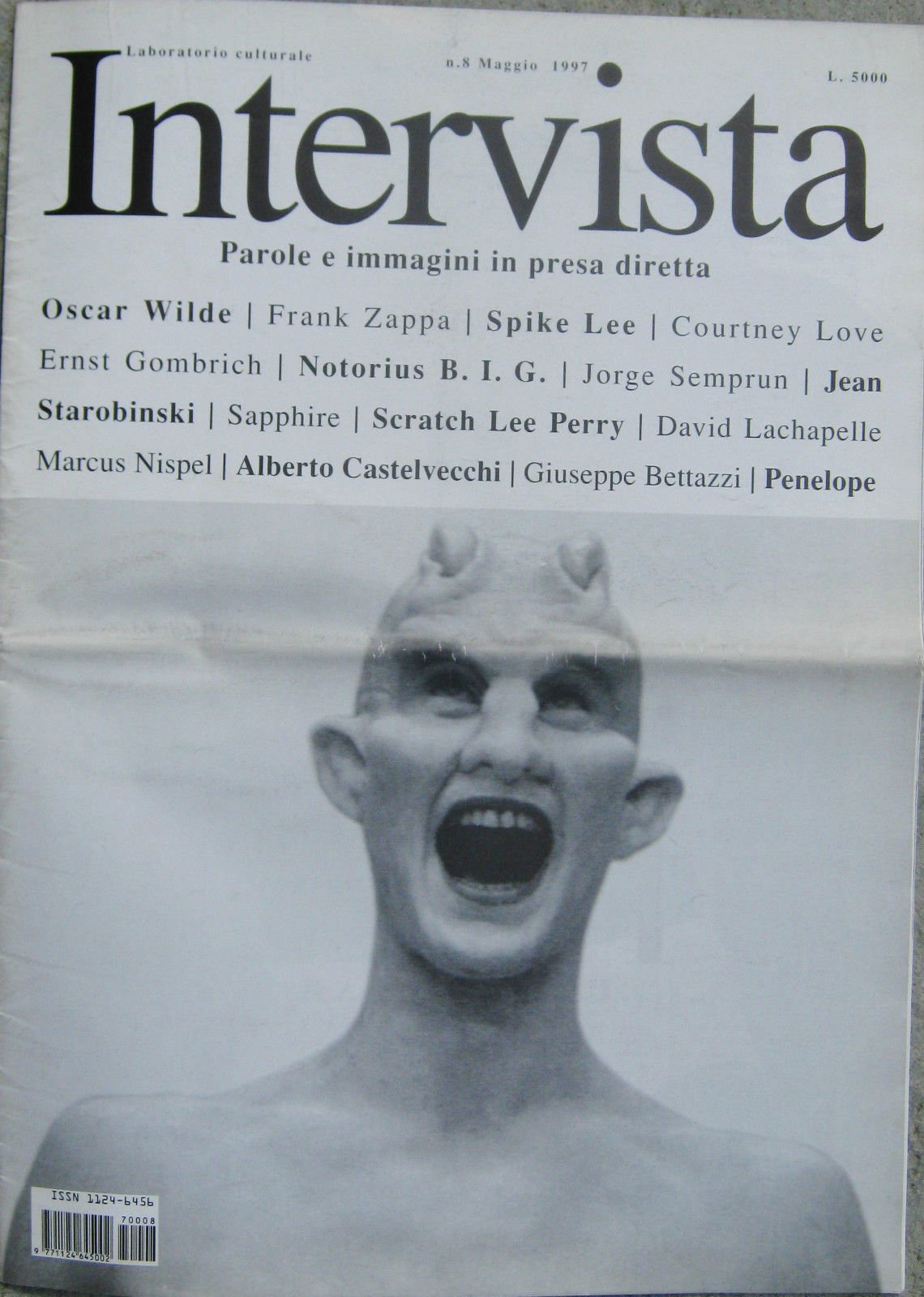 Intervista Laboratorio culturaleParole e immagini in presa direttaN^8 maggio 1997Cinema - Courtney Love  Il talento di Courtney dal grunge a HollywoodMusica - Frank Zappa Freak Out! Letteratura e memoria - Jorge Semprun  Jorge non dimenticaSpot & cinema - Marcus Nispel  Alien e l'amico tedescoEditoria - Alberto Castelvecchi  Underground? No, OvergroundL'autointervista - Oscar Wilde  Modestamente OscarCattolicesimo - Giuseppe Betazzi  Vanità che gonfia, carità che apreDoppia vita - Anonimo trevestito  Un uomo chiamato Penelope Storia dell'arte - Ernst Gombrich  Vivere di gustoPop Photo - David Lachapelle  Laschapelle e la bestiaDonne arrabbiate - Sapphire  La pietra dello scandalo   Giancarlo Politi Editore Milanorivista in buono stato (gr.200)e597