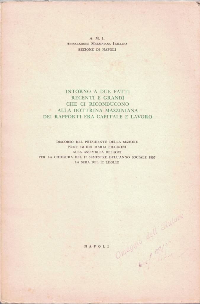 A.m.i. Associazione mazziniana italiana – sezione di Napoli, Intorno a due fatti recenti e grandi che ci riconducono alla dottrina mazziniana dei rapporti fra capitali e lavoro. Discorso del presidente della sezione prof. Guido Maria Piccinini alla assemblea dei soci per la chiusura del 1° semestre dell'anno sociale 1957, la sera del 21 luglio, s.n., Napoli s.d. (ma 1957), pp. 20, cm 22. Timbro 'omaggio dell'autore' poco visibile sulla copertina anteriore, per il resto buon esemplare.