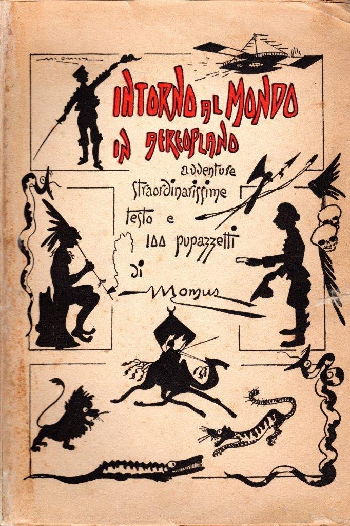 Intorno al mondo in aeroplano, prima edizione novembre 1922, pp. 118, formato 15 x 22.<BR>Copertina morbida illustrata con titoli in nero e rosso al piatto anteriore e in nero sul dorso. All'interno presenti numerose illustrazioni in b/n. <BR>Volume con dorso e piatto posteriore restaurati. Buone condizioni.