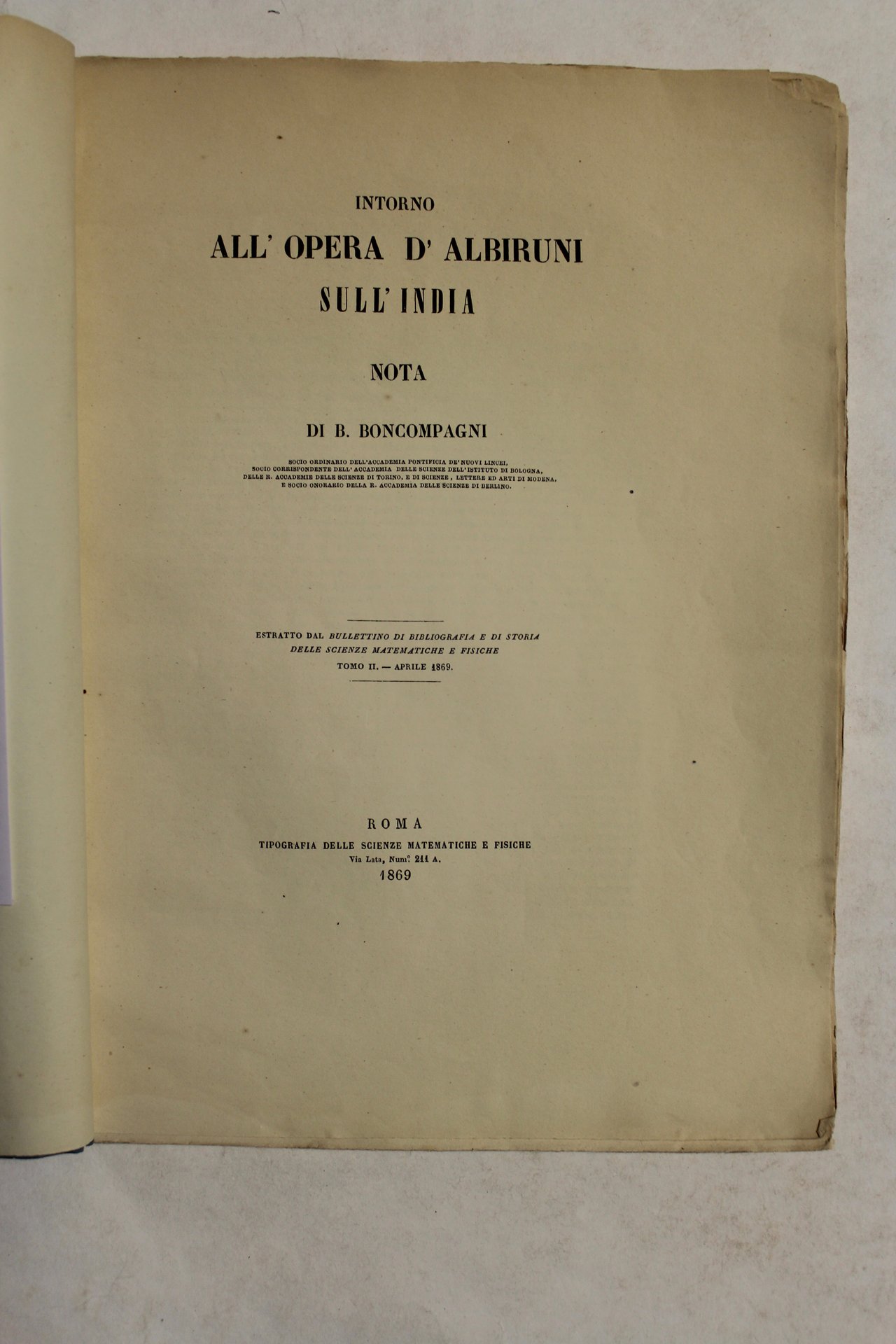 In 4° (mm 310x225); pagg. (2), 54; brossura edit. a stampa azzurra con dorso rifatto. Dedica al conte Guido Vimercati. Albiruni fu scienziato ed erudito persiano vissuto a cavallo dell'anno Mille. Buon esemplare con qualche mancanza e piega alla brossura.