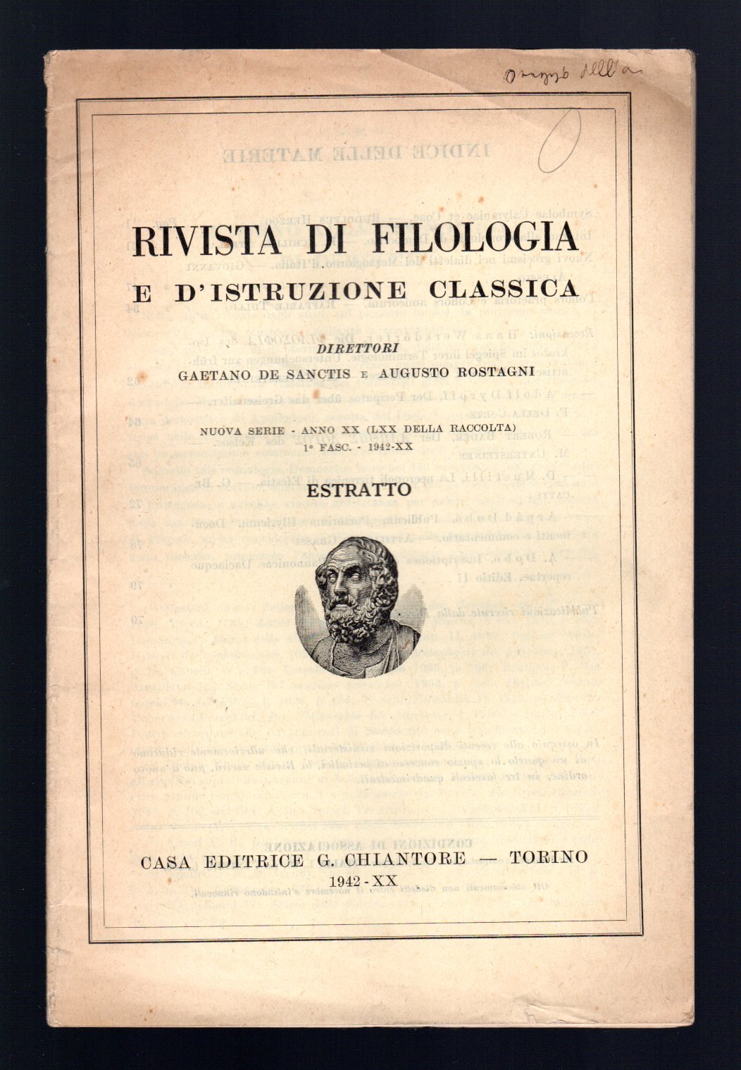 Opuscolo vintage. Estratto da Rivista di Filologia e d'Istruzione Classica Nuova Serie. Anno XX, I fasc. 1942. Segno di biro e matita in copertina. Ordinario segno del tempo. Usura da scaffale più evidente in quarta.