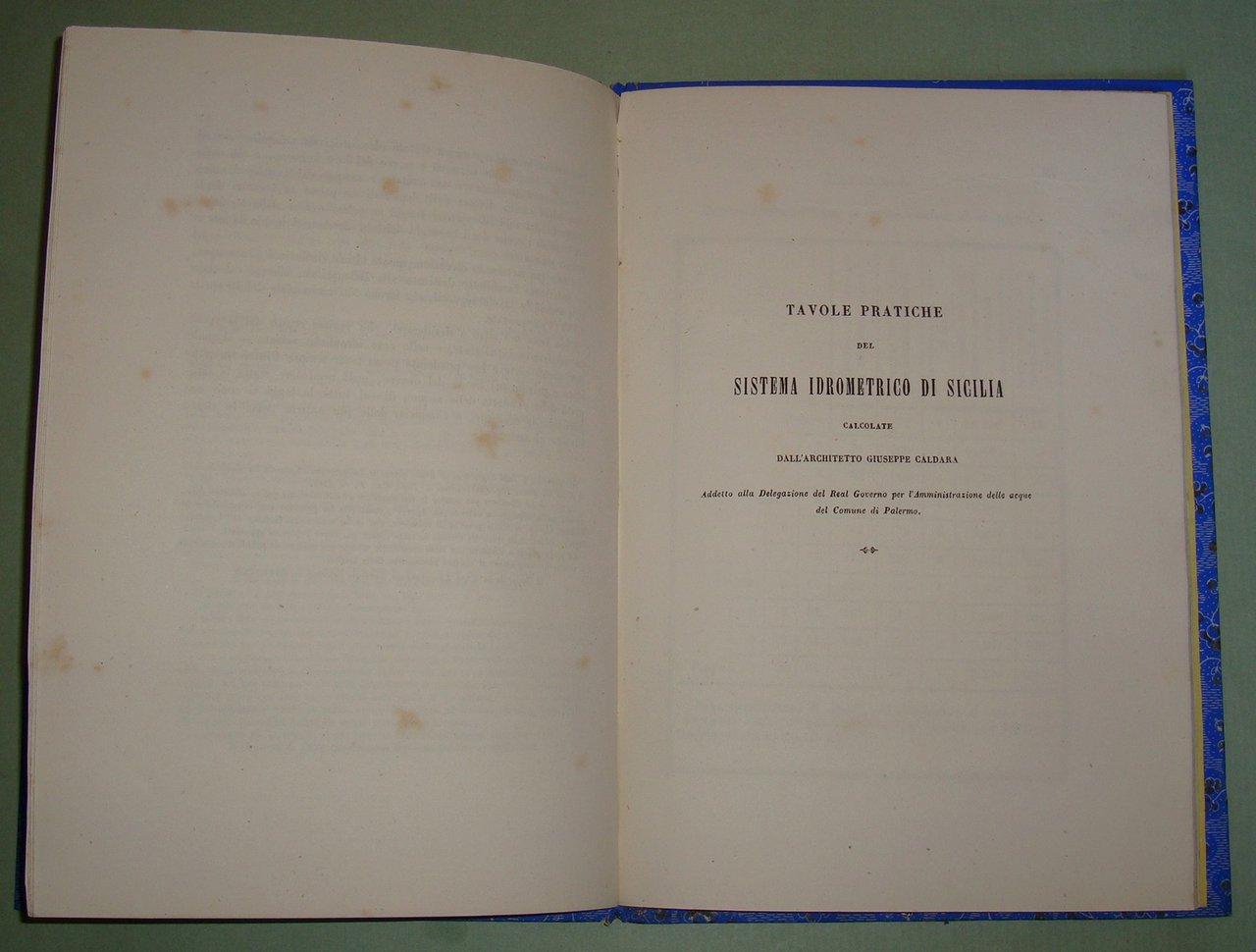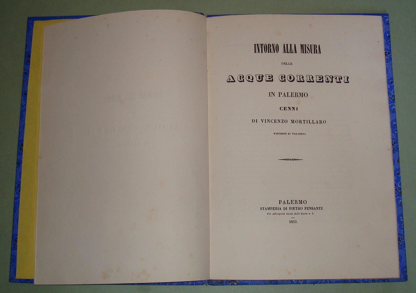 MORTILLARO Vincenzo. Intorno alla misura delle acque correnti in Palermo. Palermo, 1853. Opac Sicilia, PAL0061287. Unito: Tavole pratiche del sistema idrometrico di Sicilia calcolate dall'Architetto Giuseppe Caldara, addetto alla delegazione del Real Governo per l'Amministrazione delle acque del Comune di Palermo. S.l.n.d. Opac Sicilia, PAL0061300. Due opere in un volume in 8vo; pp.48. Cart. post. Mira II, pag.108.