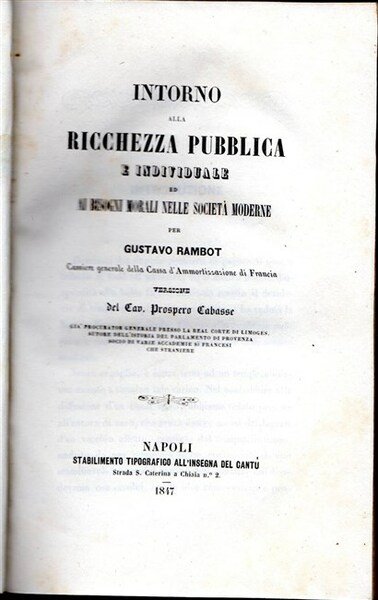 INTORNO ALLA RICCHEZZA PUBBLICA E INDIVIDUALE ed ai bisogni morali nelle socità moderne per. Versione del Cav. Prospero Cabasse.