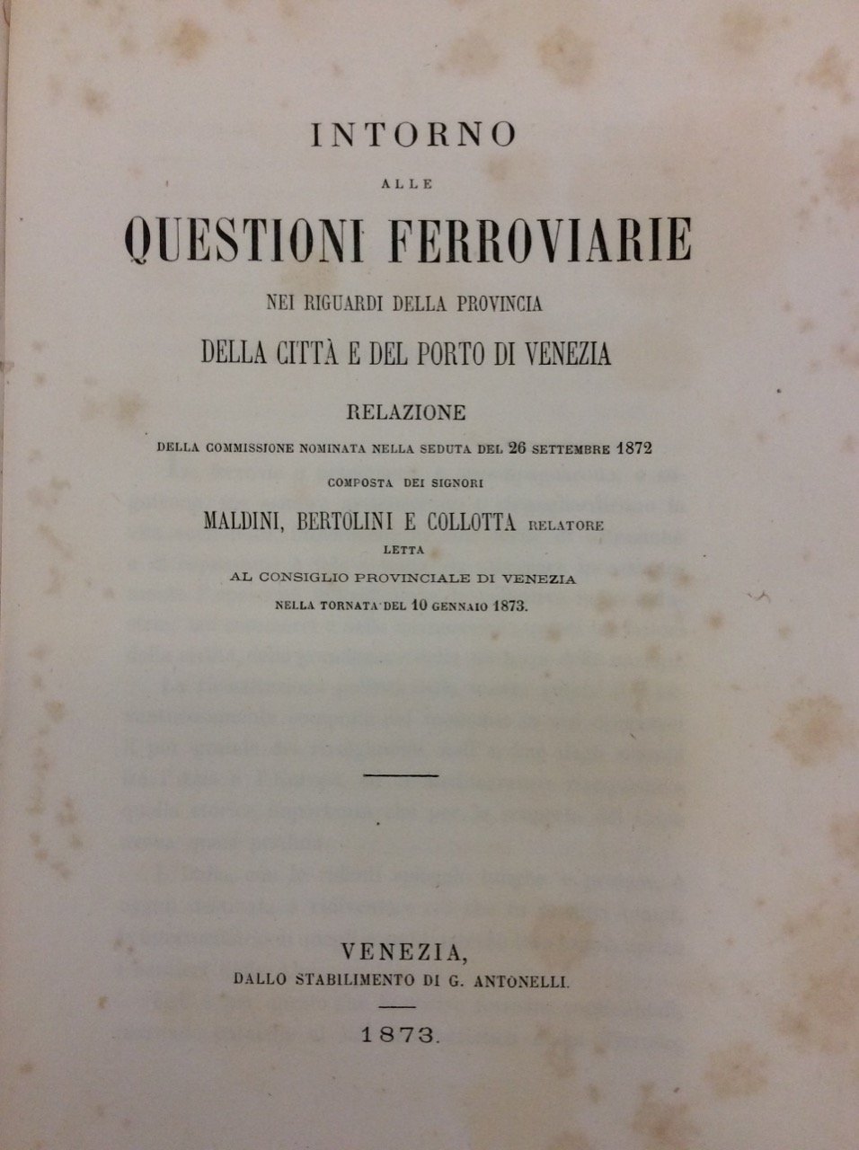 INTORNO ALLE QUESTIONI FERROVIARIE NEI RIGUARDI DELLA PROVINCIA, DELLA CITTA' E DEL PORTO DI VENEZIA. - Relazione della Commissione nominata nella seduta del 26 settembre 1872, letta al Consiglio Provinciale di Venezia nella tornata del 10 gennaio 1873.