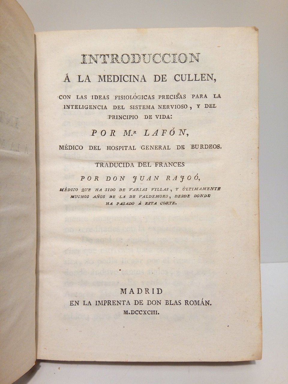 Introducción a la medicina de Cullen, con las ideas fisiológicas precisas para la inyeligencia del sistema nervioso, y del principio de vida / por Mr. Lafon, Médico del Hospital General de Burdeos. Traducida del francés por Don Juan Rajoó, médico que ha sido de varias villas, y últimamente muchos años de la de VALDEMORO, desde donde ha pasado a esta Corte