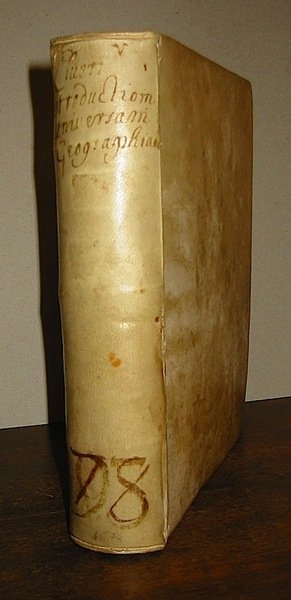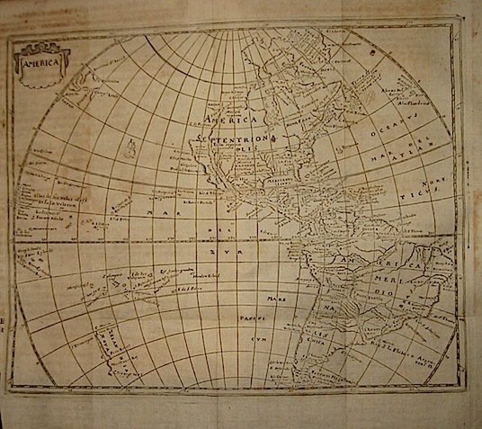 4to (cm. 22,4), 12 cc.nn. (compreso frontis. interamente inciso), 504 pp., 50 cc.nn. con 45 tavv. f.t. (di cui una tabella e 42 carte geografiche ripiegate). Frontis. in rosso e nero. Legatura ‘700 in piena pergamena rigida con titolo ms. al ds. Tagli colorati. Bruniture diffuse, più intense su alcune carte. Nel complesso, ottimo esemplare. Rara edizione in cui è presente anche la carta dell’America (California raffigurata come isola).