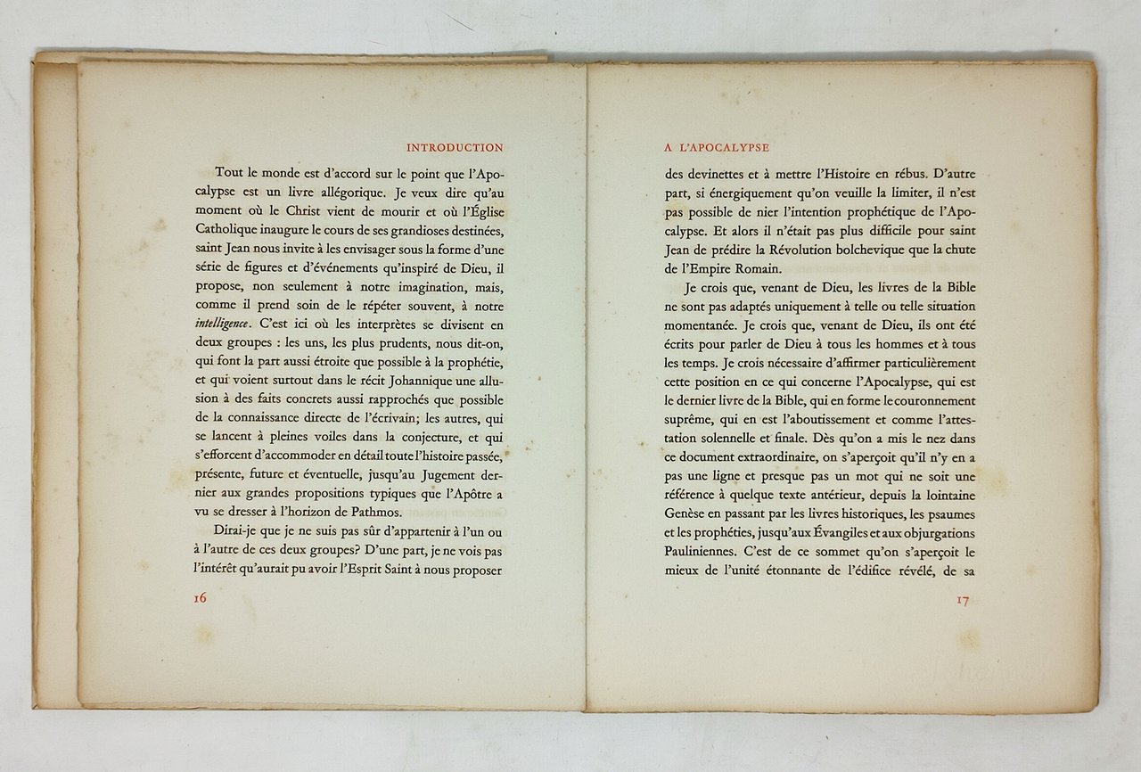 EDIZIONE ORIGINALE Esemplare numerato. Illustrations de Jean Charlot / Gravées sur bois par Gérard Angiolini. Egloff, Fribourg et L.U.F., Paris. Anno: 1946 (25 novembre). TIRATURA LIMITATA ; 'Le tirage de cet ouvrage, constituant l'édition originale, a été limité a mille exemplaires' / EXEMPLAIRE N° 466 (exemplaire sur pur fil Johannot). Frontespizio xilografico. Dimensioni: 23 x 29 cm circa. in lingua francese. Stato di conservazione: la camicia editoriale si presenta alquanto sbrindellata (con mancanze), qualche ingiallimento, una leggera curvatura centrale dell'intero corpo del volume (che probabilmente, in passato è rimasto schiacciato tra altri volumi), un'ombra (brunitura) sul retro del piatto anteriore e sulla prima pagina bianca causata dai bordi della sovraccoperta e della camicia. Nel complesso un esemplare più che discreto. coperta muta con sovraccoperta e camicia editoriale in carta velina.