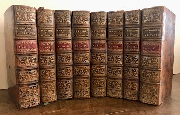 12mo (cm. 16,5), 8 Voll.; 6 cc.nn., XCII-513(1) pp.; XXXII-469(1) pp.; XXII-508 pp.; LII-545(1) pp.; XX-435(1) pp., 2 cc.nn., 126 pp., 72 cc.nn.; LXVIII-541(1) pp.; XXXIV pp., 1 c.nn. bianca, 592 pp.; 1 c.nn., XXX pp., 1 c.nn. bianca, 376 pp., 60 cc.nn. Sei antiporte (di 8, assenti quelle del VI e VII volume). Marche tipografiche in calcografia ai frontespizi stampati in rosso e nero. Ritratto f.t. del barone von Pufendorf ed una graziosa testatina incisa su rame nel primo vol. Con complessive 37 tavv. ripiegate f.t. (di cui 35 carte geografiche e 2 tabelle). Legature coeve in piena pelle con nervi, ricchi fregi, titoli e numerazione dei voll. su doppio tassello al ds. (piccole mancanze alle cuffie superiori di quattro volumi). Tagli rossi. Carte di guardia marmorizzate. Esemplare in ottimo stato di conservazione. Samuel Pufendorf (1632-1694), celebre giureconsulto e storico tedesco, fu tra i principali pensatori politici dell'Europa del tempo. Classica opera di taglio storico, geografico e politico dedicata dall’Autore ai principali stati europei e completata da Bruzen de la Martiniere (1683-1746), primo geografo del re di Spagna, per quanto concerne gli ultimi tre volumi (Asia, Americhe ed Africa). Raro, soprattutto a trovarsi completo di tutte le carte geografiche.