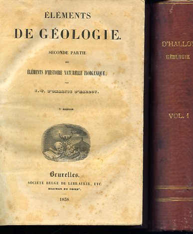 2 voll. in-8° (240x160mm), pp. VIII, 371; VIII, 414; legatura in t. tela rossa con titolo in oro ai dorsi. Vignette incise ai frontespizi. In fine del secondo vol., 3 tavv. ripiegate f.t. (tabella delle principali divisioni geologiche della Terra, litografia in b.n. della struttura della parte superiore della scorza solida della Terra, carta geognostica della Francia e delle nazioni ad essa vicine in litografia a colori). Manca l'atlante iconografico a sé, constante di 17 tavole, annunciato nel frontespizio. Fioriture e bruniture usuali,qualche alone e segno d'uso alla legatura, ma buon esemplare. Terza edizione. Jean-Baptiste d'Omalius d'Halloy (Liegi, 1783-Bruxelles, 1875) fu uno dei maggiori geologi del suo tempo, il primo a realizzare una carta geologica compiuta della Francia.Socio dell'Académie Royale de Belgique e poi Presidente di essa, nonché Presidente della Société Géologique de France dal 1852 e membro corrispondente dell'Académie des Sciences di Francia, rivestì anche numerose cariche pubbliche nella ragione di Namur.