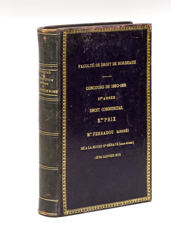 Traduit et annoté avec l'autorisation de l'auteur par G. Bourcart, 1 vol. in-8 reliure de l'époque pleine basane lie-de-vin, super libris en premier plat, fers dorés d'encadrement en plats, Auguste Durand et Pedone-Lauriel, G. Pedone-Lauriel, Paris, 1889, XXVIII-618 pp. Bon et rare exemplaire de bonne provenance, portant au premier plat la mention suivante gravée en lettres d'or : "Faculté de Droit de Bordeaux Concours 1890-1891 3me Année Droit Commercial 2e Prix Mr Ferradou André, né à la Mothe-St-Héraye (Deux-Sèvres) le 24 janvier 1872. Le professeur André Ferradou (1872-1945) fut l'élève de Paul Vigneaux et du spécialiste du droit byzantin Henri Monnier. Sa brillante thèse sur les "Biens des monastères à Byzance" lui ouvrit la voie à un succès à l'agrégation de 1898. Il enseigna à Rennes, Toulouse puis Bordeaux, où il enseigna le droit public pendant plus de 30 ans à la Faculté de Bordeaux, et y approfondit notamment le problème de la féodalité au XVIIIe siècle. Bon état (dos passé lég. frotté, qq. rouss., bon exemplaire par ailleurs).