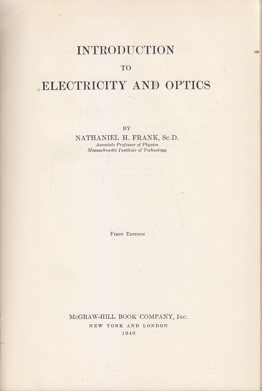 INTRODUCTION TO ELECTRICITY AND OPTICS di N. Frank 1940 McGraw Hill libro fisica