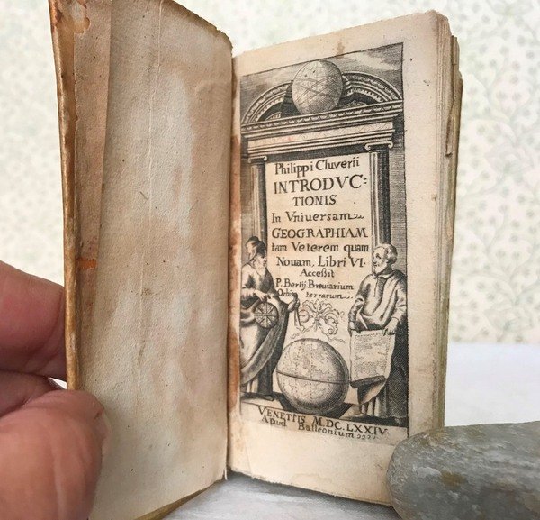 Volume in 12 (cm 5,5x11) legato in pergamena coeva, sguardie, tagli colorati di giallo, frontespizio, indice 465 pp. Opera egregia, fra i classici della geografia, il Cluverio autore che giganteggia. Una dettagliata descrizione delle varie parti della terra, precisa seppur succinta, una tavola (su due) f.t. pi volte ripiegata, il bel frontespizio inciso. Importante edizione balleoniana (purtroppo mancante di un' unica carta f.t.), assai poco comune. In ottime condizioni.