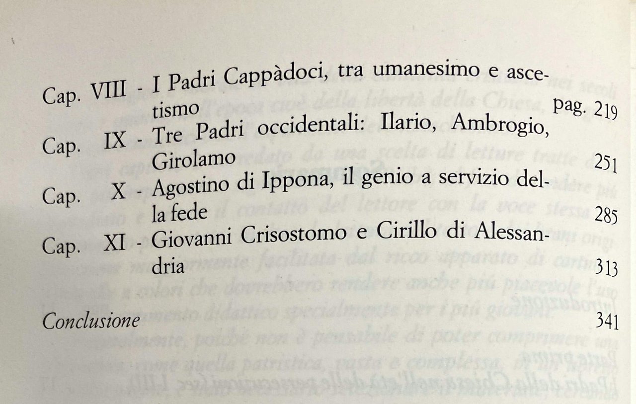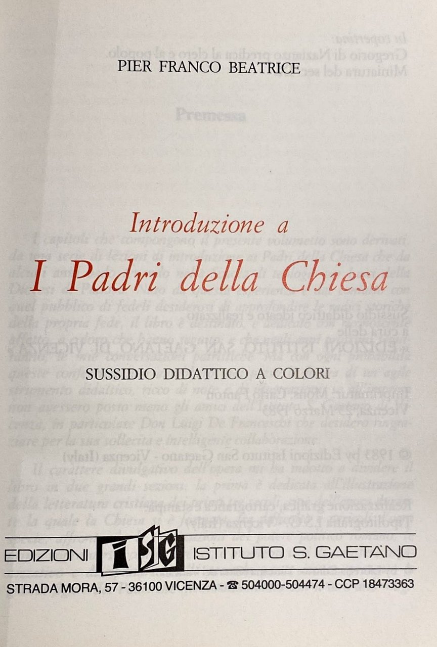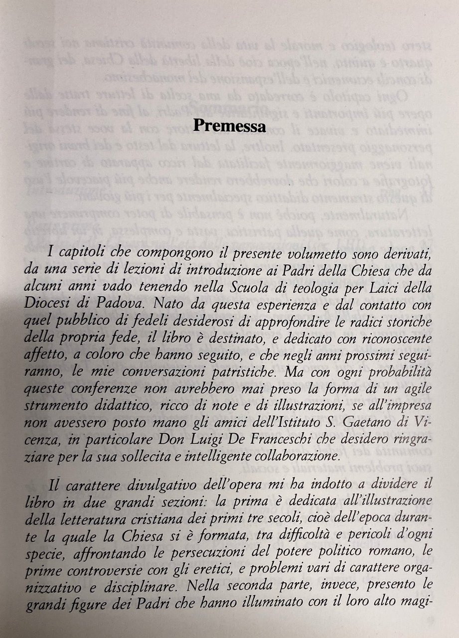 I capitoli che compongono il presente volumetto sono derivati, da una serie di lezioni di introduzione ai Padri della Chiesa che da alcuni anni vado tenendo nella Scuola di teologia per Laici della Diocesi di Padova. Nato da questa esperienza e dal contatto con quel pubblico di fedeli desiderosi di approfondire le radici storiche della propria fede, il libro è destinato, e dedicato con riconoscente affetto, a coloro che hanno seguito, e che negli anni prossimi seguiranno, le mie conversazioni patristiche. Ma con ogni probabilità queste conferenze non avrebbero mai preso la forma di un agile strumento didattico, ricco di note e di illustrazioni, se all'impresa non avessero posto mano gli amici dell'Istituto S. Gaetano di Vicenza, in particolare Don Luigi De Franceschi che desidero ringraziare per la sua sollecita e intelligente collaborazione.