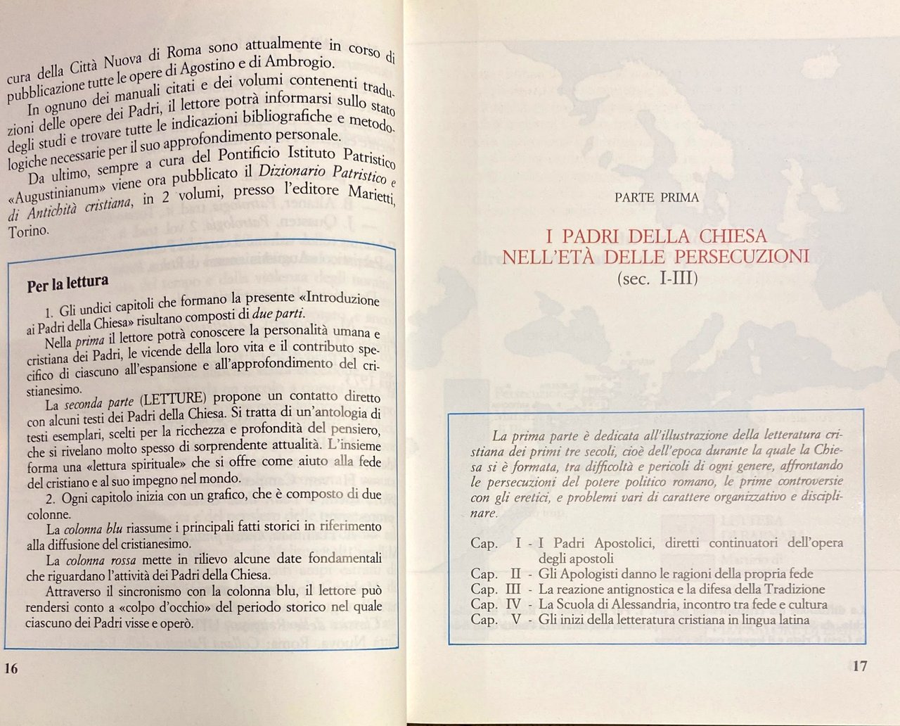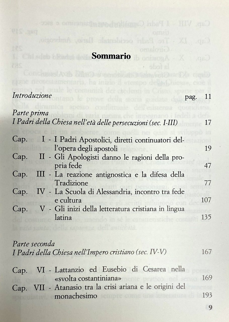 Il carattere divulgativo dell'opera mi ha indotto a dividere il libro in due grandi sezioni: la prima è dedicata all'illustrazione della letteratura cristiana dei primi tre secoli, cioè dell'epoca durante la quale la Chiesa si è formata, tra difficoltà e pericoli d'ogni specie, affrontando le persecuzioni del potere politico romano, le prime controversie con gli eretici, e problemi vari di carattere organizzativo e disciplinare. Nella seconda parte, invece, presento le grandi figure che hanno illuminato con il loro alto magistero teologico e morale la vita della comunità cristiana nei secoli quarto e quinto, nell'epoca cioè della libertà della Chiesa, dei grandi concili ecumenici e dell'espansione del monachesimo.