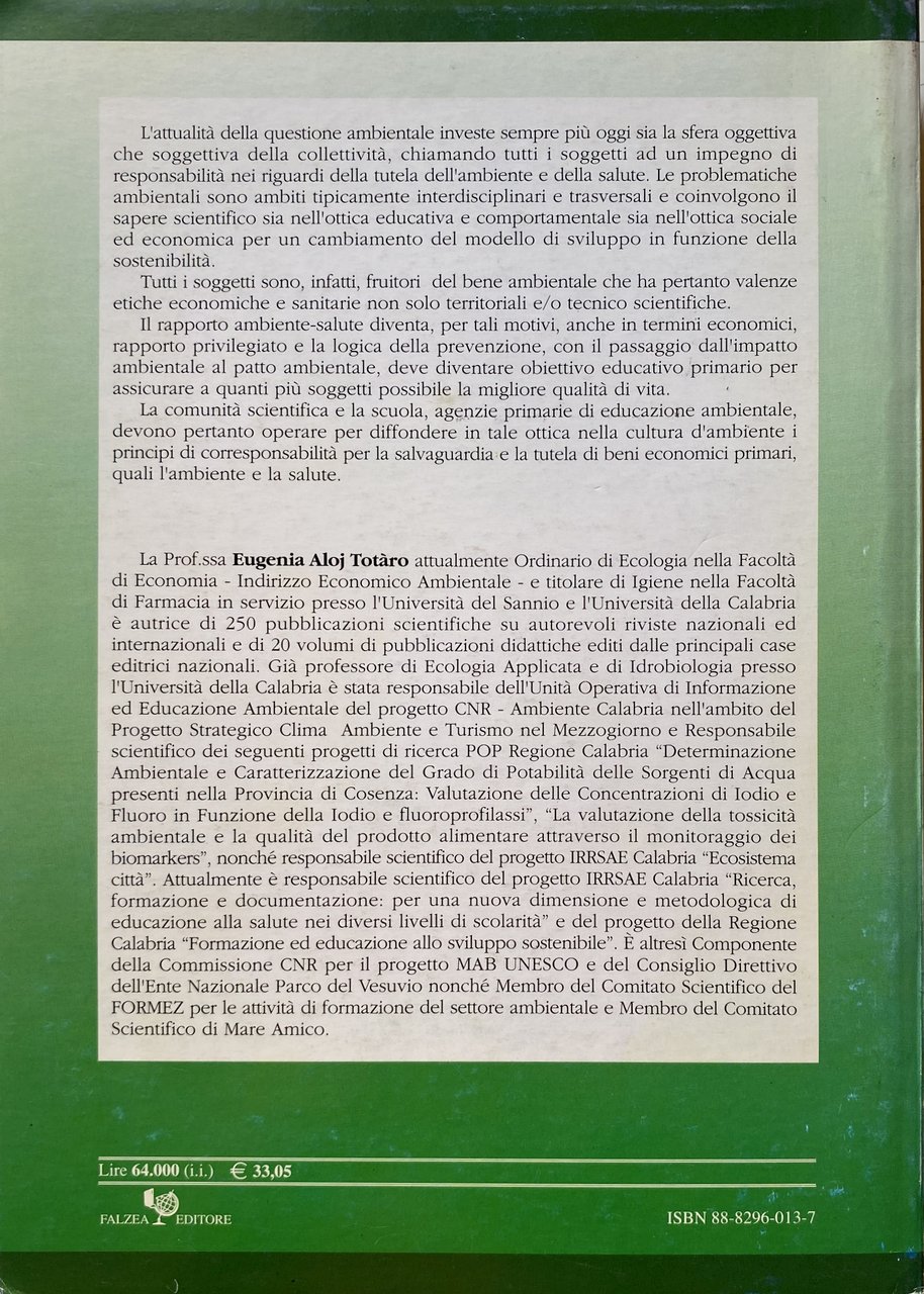 Soggetti: Ecologia, Ambiente, Igiene, Inquinamento, Manuali, Educazione, Formazione, Geografia, Organizzazioni ambientaliste, Biologia, Biodiversità, Funghi, Animali, Alghe, Acqua, Evoluzione, Forestazione, Decrescita, Sviluppo sostenibile, Impatto ambientale, Globalizzazione, Etica, Fertilizzanti Chimici, Chimica, Industrie, Territori, UNESCO, Economia, Decrescita, Ciclo, Rifiuti, Smaltimento, Consumismo, Evoluzione, Riserve, Tutela, Territorio, Turismo, Natura, Vita, Oparin, Materia, Charles Darwin, Lazzaro Spallanzani, Francesco Redi, Universo, Specie, Organismi, Didattica, Mammiferi, Uccelli, Pesci, Petrolio, Plastica, Mare, Terra, Antropico, Clima, Cambiamenti climatici, Agricoltura, Pastorizia, Allevamento, Alimentazione, Fonti energetiche, Energia, Cultura, Divulgazione scientifica, Città, Ecosistema, Urbanizzazione, Metropoli, Rischio, Degrado, Atmosfera, Isolamento, Pesticidi, Tumori, Fertilizzanti, Ghiacciai, Ciclo, Acqua, Piogge acide, Effetto serra, Consumo, Suolo, Ozono, Anidride carbonica, Dissesto idrogeologico, Edilizia, Cementificazione, Salute, Effetti, Diritto, Leggi, Norme, Europa, Italia, America, Asia, Cina, Adattamento, Prevenzione, Emergenza, Malattie infettive, Sostanze tossiche, Inquinanti, AIDS, Cancro, Mammella, Infezioni, Allergie, Asma, Batterie, Epidemie, Pandemie, Virus, Teorie, Microscopio, Raggi X, Fissismo, Evoluzionismo, Selezione, Sessualità, Riproduzione, Neotenia, Divergenza, Convergenza evolutiva, Collaborazione, Oceano, Riserve, Umidità, Temperatura, Radiazioni, Rumore, Licheni, Indicatori, Liquami, Sole, Biotecnologie, Carbone, Nucleare, Latta, Alluminio, Migrazioni, Demografia, Crescita, Pianeta, Depurazione, Sprechi, Pesca, Paesaggio, Documenti, Scuola, Università, Libri Vintage fuori catalogo, Regolamento, Romano Viviani, Libro tecnico professionale, Pietro Battaglini, Ecology, Environment, Hygiene, Pollution, Textbooks, Education, Training, Geography, Environmental organisations, Biology, Biodiversity, Mushrooms, Animals, Algae, Water, Evolution, Forestry, Decrease, Sustainable development, Environmental impact, Globalization, Ethics, Chemical Fertilizers, Chemistry, Industries, Territories, Economy, Decrease, Cycle, Waste, Disposal, Consumerism, Evolution, Reserves, Protection, Territory, Tourism, Nature, Life, Matter, Universe, Species, Organisms, Didactics, Mammals, Birds, Fishes, Oil, Plastic, Sea, Earth, Anthropic, Climate change, Agriculture, Pastoralism, Farming, Supply, Energy sources, Energy, Culture, Popularization of science, City, Ecosystem, Urbanization, Metropolis, Risk, Degradation, Atmosphere, Isolation, Pesticides, Tumors Cycle, Water, Acid rain, Greenhouse effect, Fertilizers, Glaciers, Consumption, Soil, Ozone, Carbon dioxide, Hydrogeological instability, Construction, Cementing, Health, Effects, Right, Laws, Norms, Europe, Italy, China, Adaptation, Prevention, Emergencies, Infectious diseases, Toxic substances, Pollutants, Cancer, Breast, Infections, Allergies, Asthma, Batteries, Epidemics, Pandemics, Viruses, Theories, Microscope, X-rays, Fixism, Evolutionism, Selection, Sexuality, Reproduction, Neoteny, Divergence, Evolutionary convergence, Collaboration, Ocean, Reserves, Humidity, Temperature, Radiation, Noise, Lichens, Indicators, Sewage, Sun, Biotechnology, Coal, Nuclear, Tin, Aluminium, Migrations, Demography, Growth, Planet, Purification, Waste, Fishing, Landscape, Documents, School, University, Out of print books, Regulations, Professional technical book