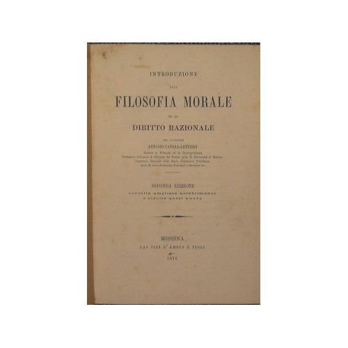in 8° - pp.VI + 451 - Tela con fregi ai piatti ed al dorso - Seconda edizione corretta ampliata notabilmente e ridotta quasi nuova - Tela scolorita e con mende, mancano la prima e l'ultima bianca sostituite in fase di rilegatura. - Il Catara-Lettieri nacque a Messina nel 1809. Compì i primi studi con Cristaudda, Cuppari, Aloisio e Pisapia, ma fu il Galluppi che sviluppò il suo ingegno. Dopo varie traversie comincio a pubblicare alcuni 'Opuscoli filosofici' nel 1836, che ebbero il plauso del Galluppi, del Tedeschi e della stampa. Poi pubblicò la 'Dissertazione sul Sensismo' e la 'Filosofia calunniata di materialismo' che furono accolte molto bene dalla stampa periodica e lodate dal Galluppi, dal Mamiani a Parigi e dal Gioberti a Bruxelles.Nel 1847 venne nominato professore sostituto alla Cattedra di Diritto filosofico nel Seminario arcivescovile del Monastero dei Cistercensi nella Casa dei Teatini. Nel 1848 pubblicò l'Elogio alla Libertà' dedicata a Ruggiero Settimo e fu Presidente del Circolo politico 'La Tribuna del Popolo'. Fece la campagna della guerra dell'Indipendenza nel 1848 e fu decorato della Medaglia commemorativa. Il 'Poligrafo' di Palermo lodò i pensieri del Catara pubblicando alcuni dei suoi dialoghi nel 1872, anno di pubblicazione della seconda edizione della sia 'Introduzione alla filosofia morale ed al diritto razionale', opera molto lodata da filosofi italiani e stranieri. Nel 1865 fu nominato professore ordinario di filosofia del diritto all'università di Messina, ed infine preside della facoltà giuridica dell'Università di Messina. Cfr. Mira vol. I, pag. 208; De Gubernatis 'Dizionario biografico degli scrittori contemporanei', pag. 269-270.