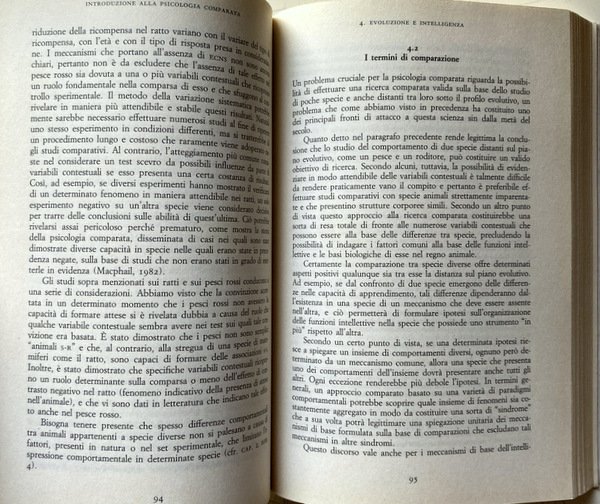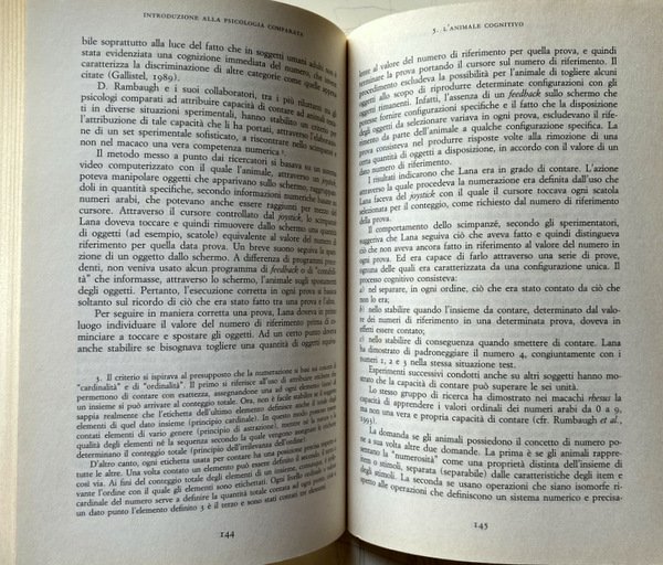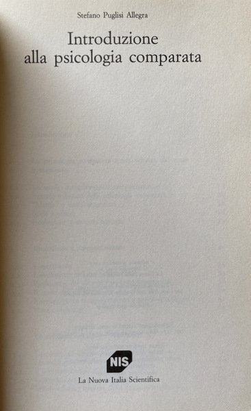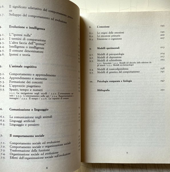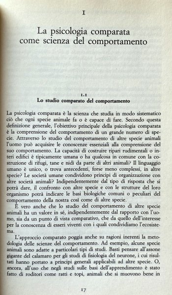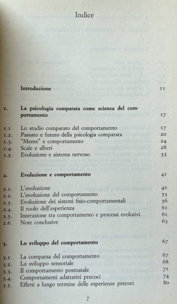 La psicologia comparata come scienza del comportamento / Lo studio comparato del comportamento / Passato e futuro della psicologia comparata / Mente e comportamento/ Scale e alberi/ Evoluzione e sistema nervoso / Evoluzione e comportamento / L'evoluzione / L'evoluzione del comportamento/ Evoluzione dei sistemi fisio-comportamentali / Il ruolo dell’esperienza / Interazione tra comportamento e processi evolutivi / Lo sviluppo del comportamento / La comparsa del comportamento / Lo sviluppo sensoriale / Il comportamento postnatale / Comportamenti adattativi precoci / Effetti a lungo termine delle esperienze precoci / Il significato adattativo del comportamento precoce / Sviluppo del comportamento ed evoluzione / Evoluzione e intelligenza/ L'"ipotesi nulla"/ I termini di comparazione / L'altra faccia dell'"ipotesi"/ Intelligenza o intelligenze/ Il comune denominatore/ Ipotesi e teoria / L'animale cognitivo/ Comportamento o apprendimento/ Apprendimento e memoria/ Formazione dei concetti / L'approccio piagetiano/ Spazio, tempo e numeri / Comunicazione e linguaggio/ La comunicazione negli animali / Linguaggi artificiali / Linguaggio e pensiero / Il comportamento sociale / Comportamento sociale ed evoluzione / Comportamento sociale e organizzazione sociale / Trasformazione della funzione / Organizzazione sociale ed evoluzione / Effetti dell’organizzazione sociale sull’evoluzione / L'emozione / Le origini delle emozioni/ Le emozioni primarie / Emozione e cognizione / Modelli sperimentali / Modelli di psicopatologia / Modelli di depressione / Modelli di schizofrenia / Modelli di tossicodipendenza / Modelli di genetica del comportamento / Psicologia comparata e biologia.