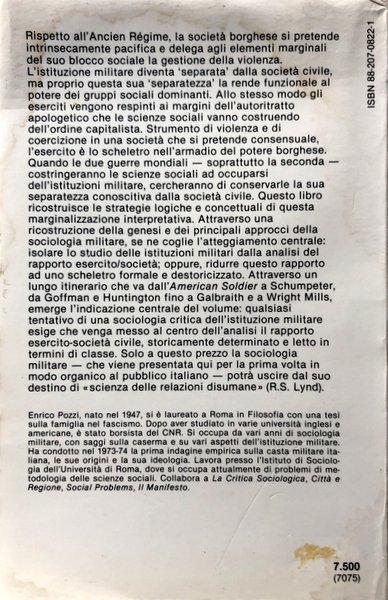 Soggetti: Scienze sociali, Sociologia generale, Saggi, Militaria, Istituzioni politiche, Eserciti, Armamenti, Nemico, Forze armate, Politica, Organizzazione, Guerra, Pace, Ancien Régime, Borghesia, Cultura militare, Violenza, Monopolio, Soldati, Stato, Potere, Capitalismo, Società moderna, Classi sociali, Società civile, Relazioni, Teorie, Filosofia, Educazione, Suicidio, Disciplina, Ordine, Ruoli, Razionalismo burocratico, Reclutamento, Guerre mondiali, Stati Uniti, Genealogia, Vietnam, Atteggiamenti disfunzionali, Tecnologia, Consenso, Esercito americano, Professionale, Carriera, Corporazione, Capacità bellica, Beverly Hills, American soldier, Missioni, Servizio di leva, Peace-keeping, Caserme, Gradi, Combattimento, Formalismo, Regole, Ideologie, Andrewski, Liberalismo, Antimilitarismo, Pacifismo, Imperialismo, Professione, Schumpeter, Moskos, Janowitz, Saint-Simon, Goffman, Max Weber, Samuel Huntington, Galbraith, Wright Mills, Libri rari, Libri Vintage, Fuori catalogo, Social Sciences, Sociology General, Essays, Political Institutions, Armies, Armaments, Enemy, Armed Forces, Politics, Organization, War, Peace, Bourgeoisie, Military Culture, Violence, Monopoly, Soldiers, State, Power, Capitalism, Modern Society, Social Classes, Civil Society, Relations, Theories, Philosophy, Education, Suicide, Discipline, Order, Roles, Bureaucratic rationalism, Recruitment, World Wars, United States, Genealogy, Dysfunctional Attitudes, Technology, Consensus, US Army, Professional, Career, Guild, Capacity war, Lever service, Barracks, Degrees, Combat, Formalism, Rules, Ideologies, Antimilitarism, Pacifism, Imperialism, Profession, Rare books, Out of print books