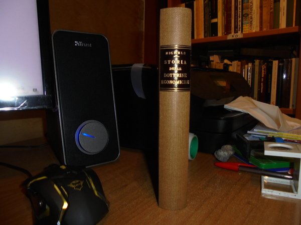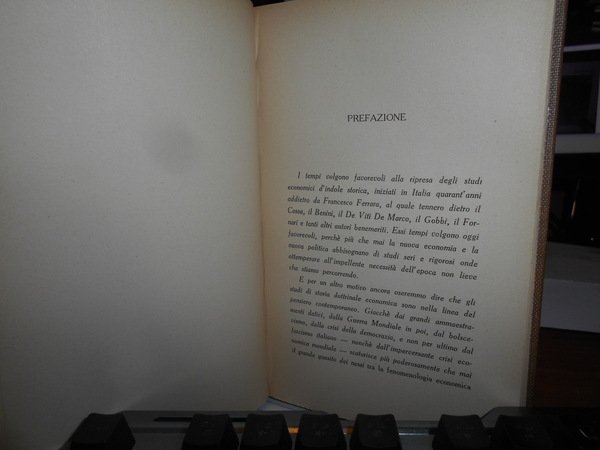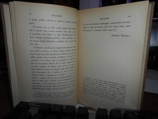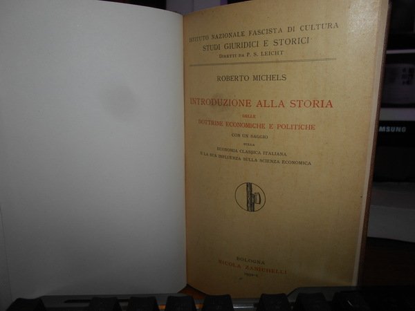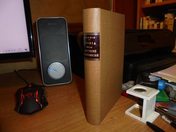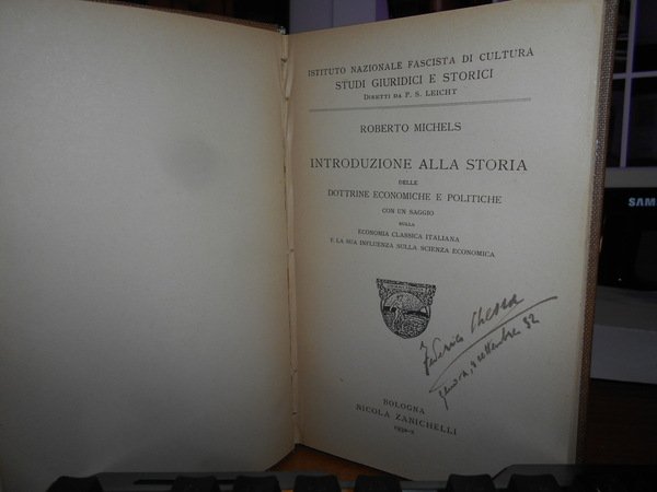 Roberto Michels. Bologna, Nicola Zanichelli, 1932. Introduzione alla Storia delle dottrine economiche e politiche con un saggio sulla economia classica italiana e la sua influenza sulla scienza economica. In-16°, tela con titolo in oro entro tassello al dorso, copertine originali conservate. xiii, 310 pp. Ottimo esemplare in legatura recente con le brossure originali conservate e firma al frontespizio di un grande economista del passato. Uff. B - III - 3